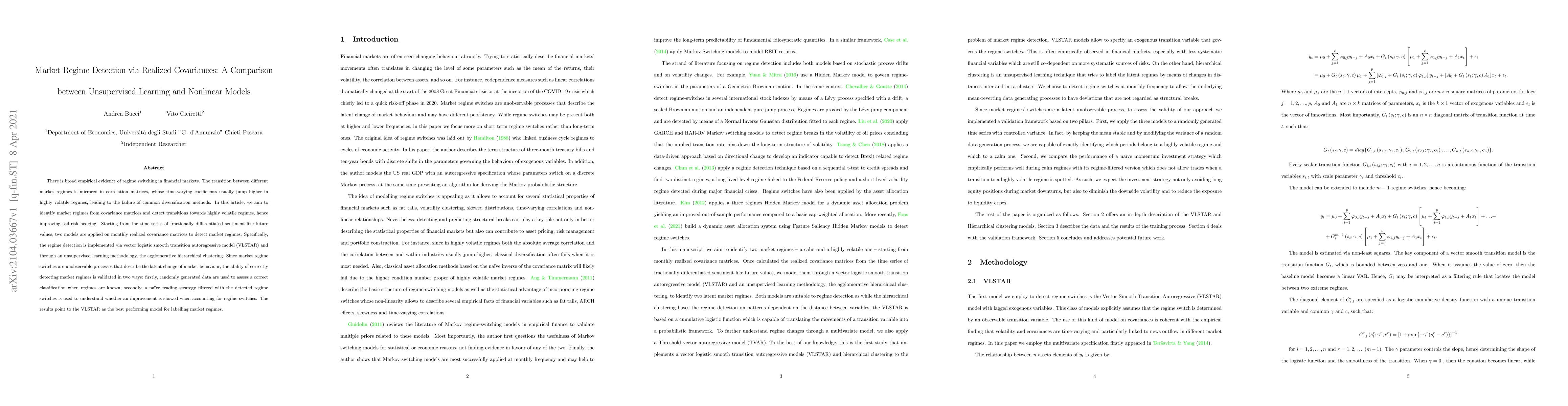 A study compares two methods to detect market regimes from covariance matrices: vector logistic smooth transition autoregressive model (VLSTAR) and unsupervised learning via agglomerative hierarchical clustering. VLSTAR is found to be the best performing model for labelling market regimes.