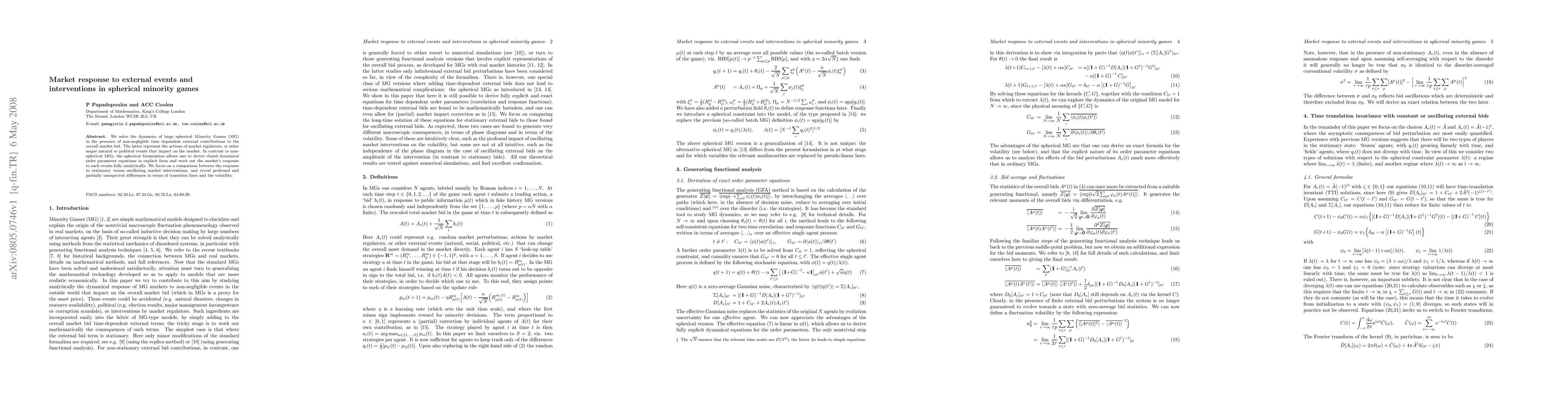 We solve the dynamics of large spherical Minority Games (MG) in the presence of non-negligible time dependent external contributions to the overall market bid. The latter represent the actions of market regulators, or other major natural or political events that impact on the market. In contrast to non-spherical MGs, the spherical formulation allows one to derive closed dynamical order parameter equations in explicit form and work out the market's response to such events fully analytically. We focus on a comparison between the response to stationary versus oscillating market interventions, and reveal profound and partially unexpected differences in terms of transition lines and the volatility.
