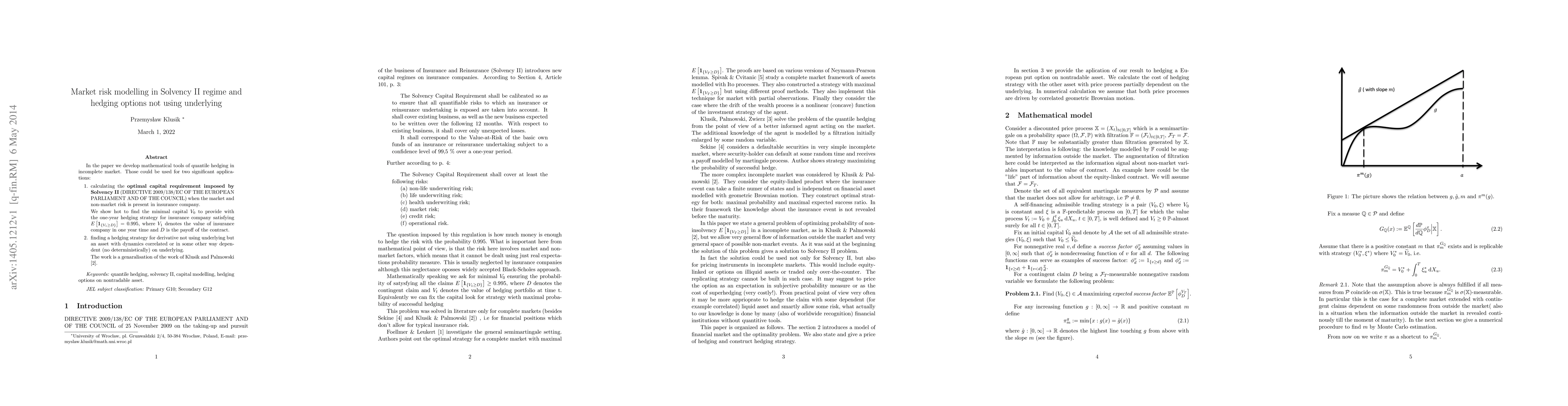 This paper develops mathematical tools for quantile hedging in incomplete markets, focusing on calculating optimal capital requirements under Solvency II for insurance companies and devising hedging strategies for derivatives not tied to the underlying asset. Keywords: quantile hedging, solvency II, capital modelling, hedging options on nontradable asset.