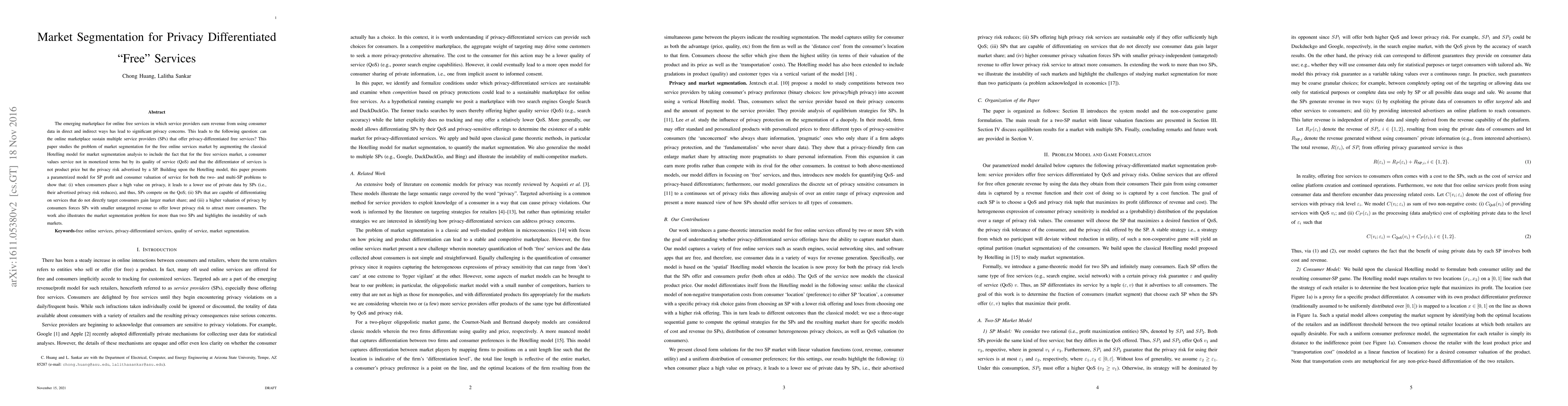 This paper explores market segmentation in the free online services market, adapting the Hotelling model to account for privacy risk as the key differentiator. It finds that high consumer valuation of privacy leads to lower use of private data by service providers, resulting in competition based on quality of service rather than price.