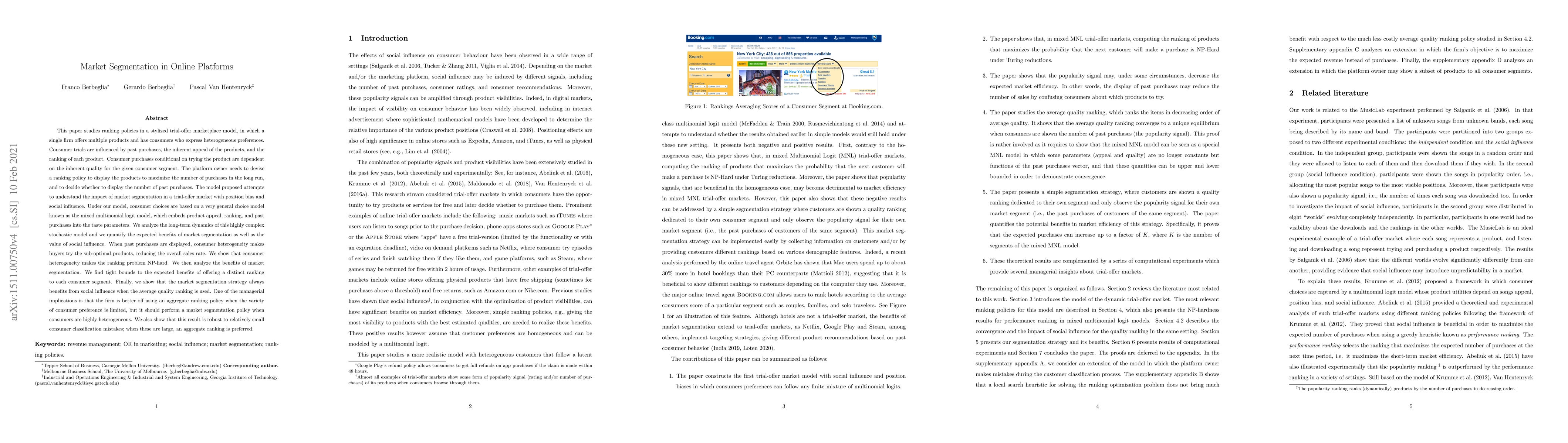 This paper explores ranking policies in a trial-offer marketplace with consumer heterogeneity and social influence, finding that market segmentation can significantly boost sales. It concludes that firms should adopt segmentation when consumer preferences are diverse but use an aggregate ranking when preferences are more uniform.