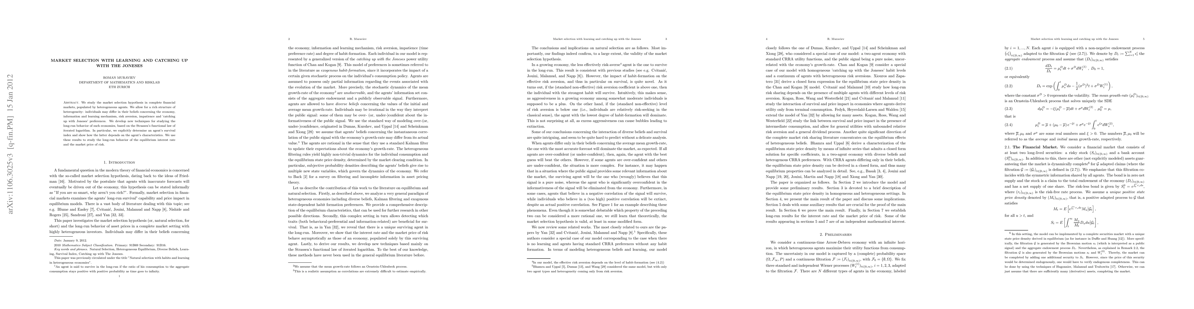 We study the market selection hypothesis in complete financial markets, populated by heterogeneous agents. We allow for a rich structure of heterogeneity: individuals may differ in their beliefs concerning the economy, information and learning mechanism, risk aversion, impatience and 'catching up with Joneses' preferences. We develop new techniques for studying the long-run behavior of such economies, based on the Strassen's functional law of iterated logarithm. In particular, we explicitly determine an agent's survival index and show how the latter depends on the agent's characteristics. We use these results to study the long-run behavior of the equilibrium interest rate and the market price of risk.