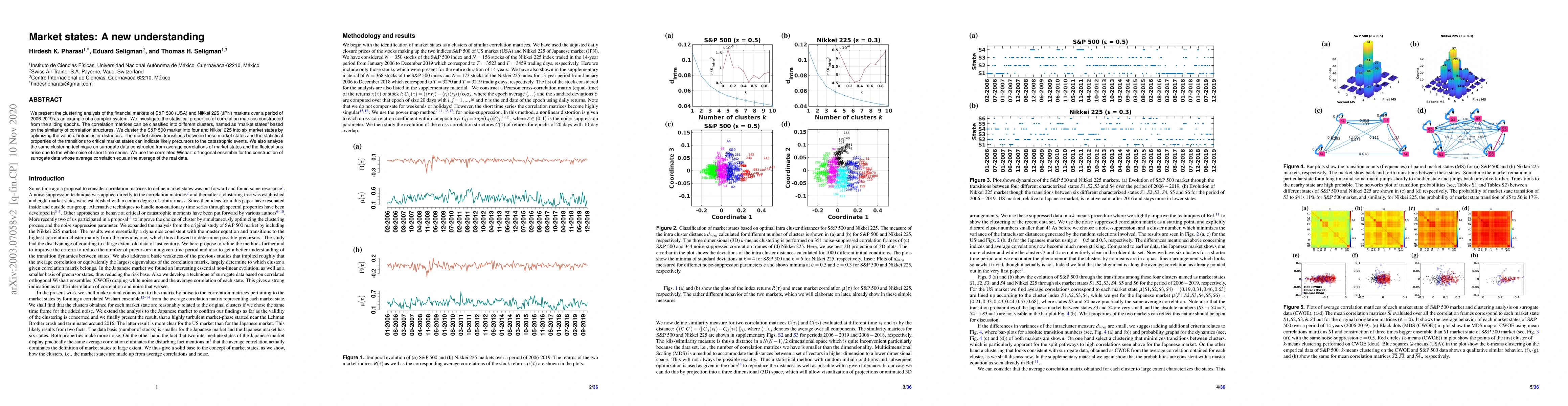 We present the clustering analysis of the financial markets of S&P 500 (USA) and Nikkei 225 (JPN) markets over a period of 2006-2019 as an example of a complex system. We investigate the statistical properties of correlation matrices constructed from the sliding epochs. The correlation matrices can be classified into different clusters, named as market states based on the similarity of correlation structures. We cluster the S&P 500 market into four and Nikkei 225 into six market states by optimizing the value of intracluster distances. The market shows transitions between these market states and the statistical properties of the transitions to critical market states can indicate likely precursors to the catastrophic events. We also analyze the same clustering technique on surrogate data constructed from average correlations of market states and the fluctuations arise due to the white noise of short time series. We use the correlated Wishart orthogonal ensemble for the construction of surrogate data whose average correlation equals the average of the real data.