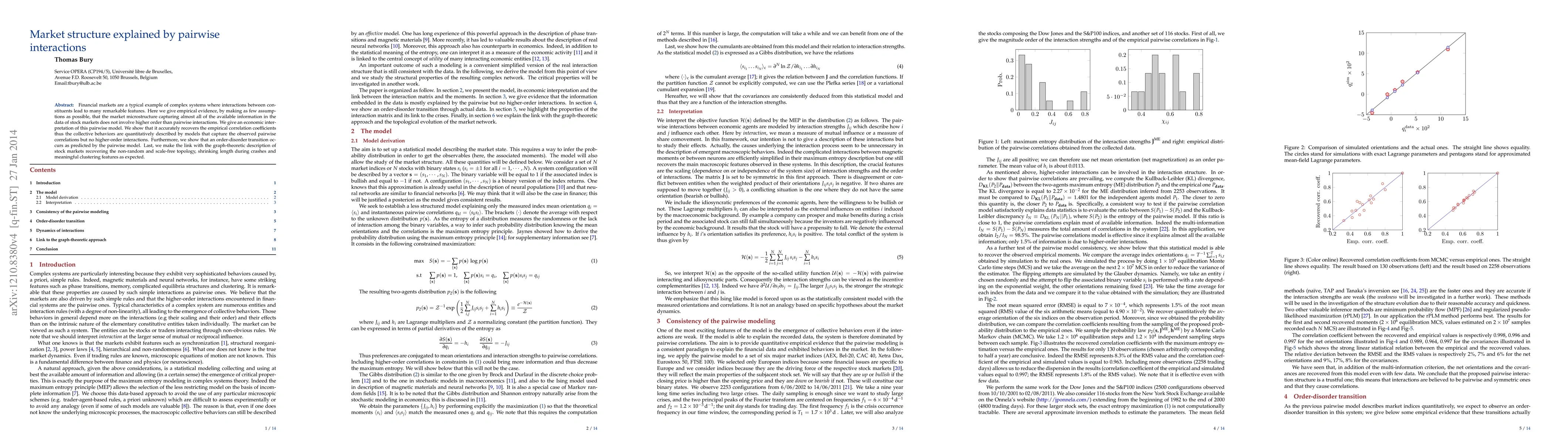 Financial markets are a typical example of complex systems where interactions between constituents lead to many remarkable features. Here, we show that a pairwise maximum entropy model (or auto-logistic model) is able to describe switches between ordered (strongly correlated) and disordered market states. In this framework, the influence matrix may be thought as a dissimilarity measure and we explain how it can be used to study market structure. We make the link with the graph-theoretic description of stock markets reproducing the non-random and scale-free topology, shrinking length during crashes and meaningful clustering features as expected. The pairwise model provides an alternative method to study financial networks which may be useful for characterization of abnormal market states (crises and bubbles), in capital allocation or for the design of regulation rules.