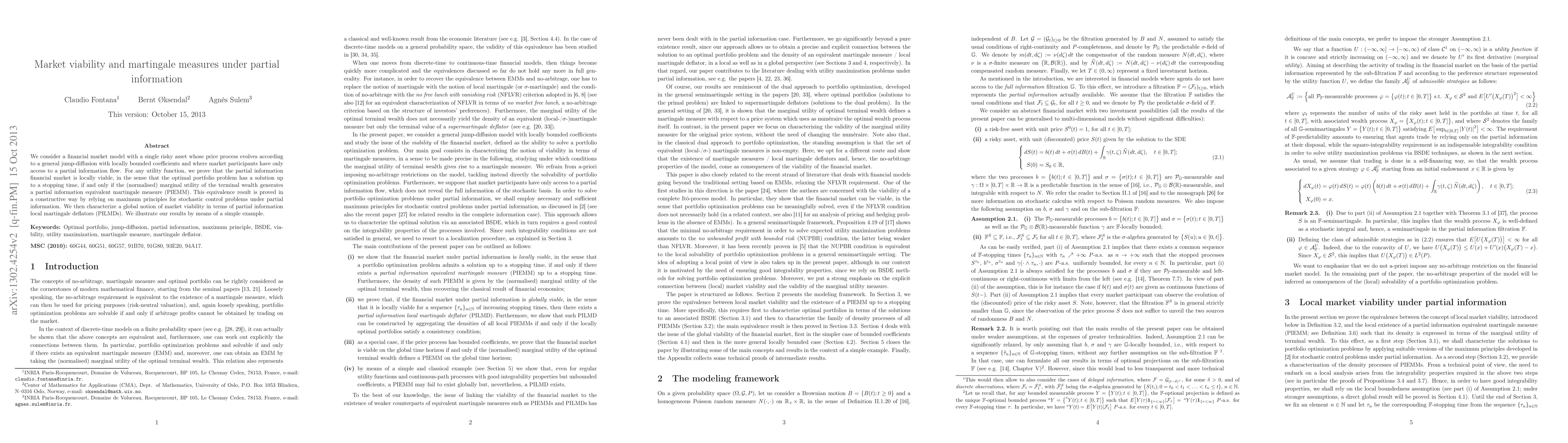 This paper proves the local viability of a financial market with partial information, showing that optimal portfolio solutions exist if a normalized marginal utility generates a partial information equivalent martingale measure (PIEMM). The authors characterize market viability using partial information local martingale deflators (PILMDs) and demonstrate their findings through a simple example.