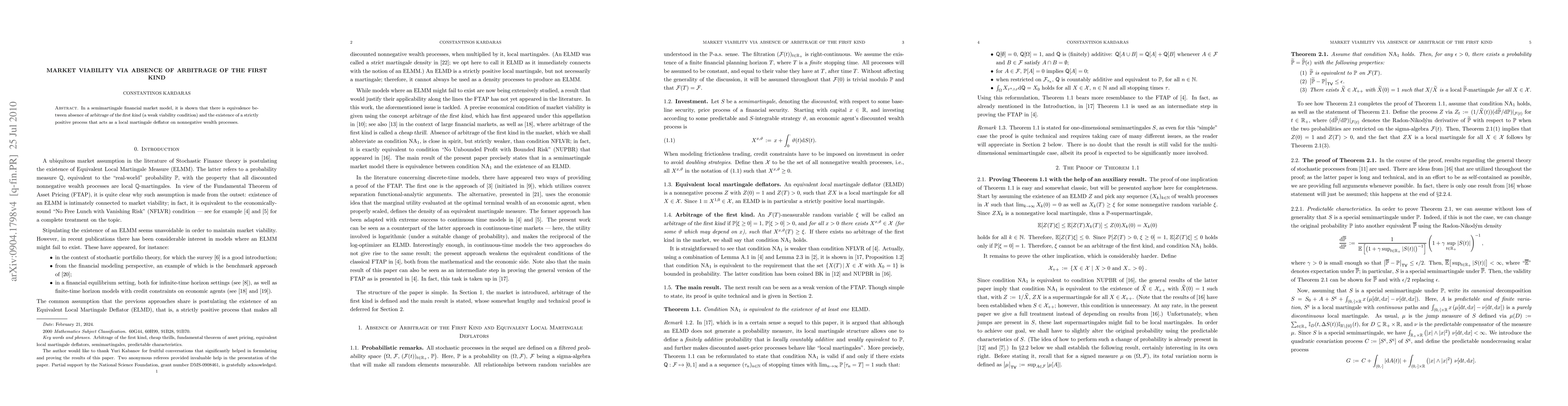Summary: The paper demonstrates that in a semimartingale financial market model, the absence of arbitrage of the first kind is equivalent to the existence of a strictly positive local martingale deflator for nonnegative wealth processes, establishing a key viability condition.