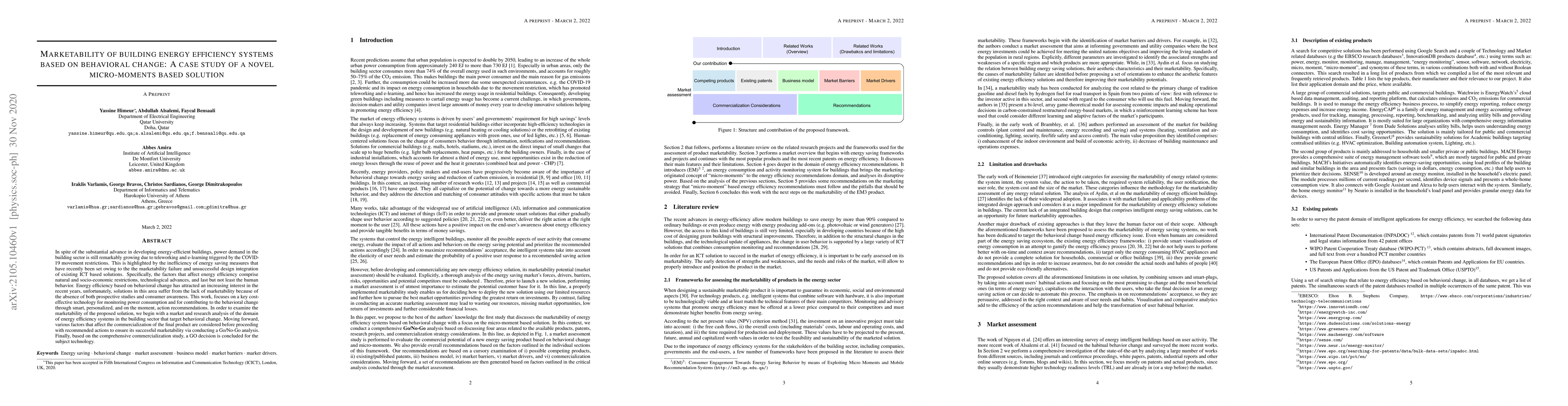 In spite of the substantial advance in developing energy-efficient buildings, power demand in the building sector is still remarkably growing due to teleworking and e-learning triggered by the COVID-19 movement restrictions. This is highlighted by the inefficiency of energy saving measures that have recently been set owing to the the marketability failure and unsuccessful design integration of existing ICT based solutions. Specifically, the factors that affect energy efficiency comprise natural and socio-economic restrictions, technological advances, and last but not least the human behavior. Energy efficiency based on behavioral change has attracted an increasing interest in the recent years, unfortunately, solutions in this area suffer from the lack of marketability because of the absence of both prospective studies and consumer awareness. This work, focuses on a key cost-effective technology for monitoring power consumption and for contributing to the behavioral change through smart, personalized, and on the moment, action recommendations. In order to examine the marketability of the proposed solution, we begin with a market and research analysis of the domain of energy efficiency systems in the building sector that target behavioral change. Moving forward, various factors that affect the commercialization of the final product are considered before proceeding with recommended actions to ensure its successful marketability via conducting a Go/No-Go analysis. Finally, based on the comprehensive commercialization study, a GO decision is concluded for the subject technology.