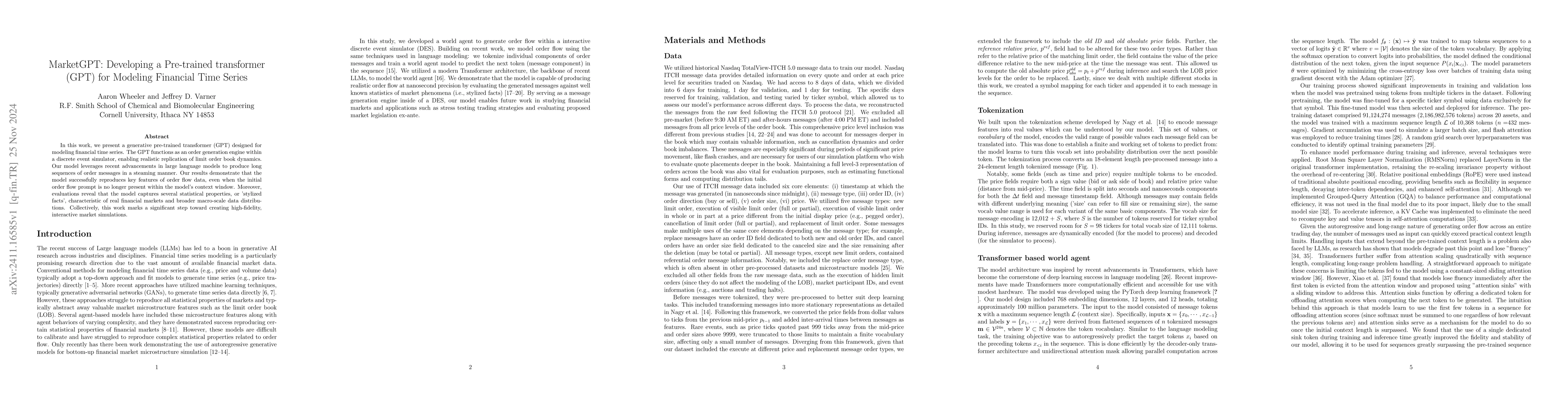 This work presents a generative pre-trained transformer (GPT) designed for modeling financial time series. The GPT functions as an order generation engine within a discrete event simulator, enabling realistic replication of limit order book dynamics. Our model leverages recent advancements in large language models to produce long sequences of order messages in a steaming manner. Our results demonstrate that the model successfully reproduces key features of order flow data, even when the initial order flow prompt is no longer present within the model's context window. Moreover, evaluations reveal that the model captures several statistical properties, or 'stylized facts', characteristic of real financial markets and broader macro-scale data distributions. Collectively, this work marks a significant step toward creating high-fidelity, interactive market simulations.