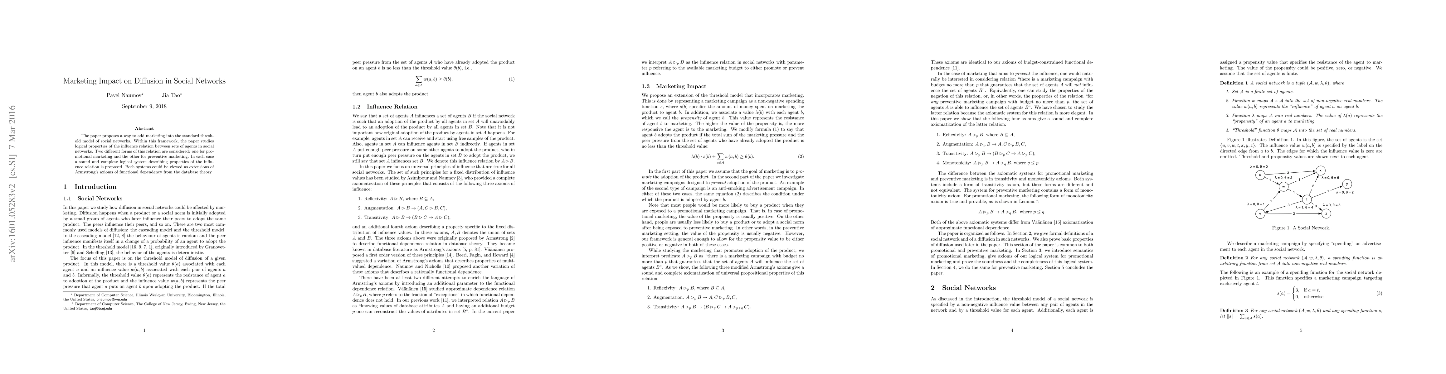 The paper proposes a way to add marketing into the standard threshold model of social networks. Within this framework, the paper studies logical properties of the influence relation between sets of agents in social networks. Two different forms of this relation are considered: one for promotional marketing and the other for preventive marketing. In each case a sound and complete logical system describing properties of the influence relation is proposed. Both systems could be viewed as extensions of Armstrong's axioms of functional dependency from the database theory.