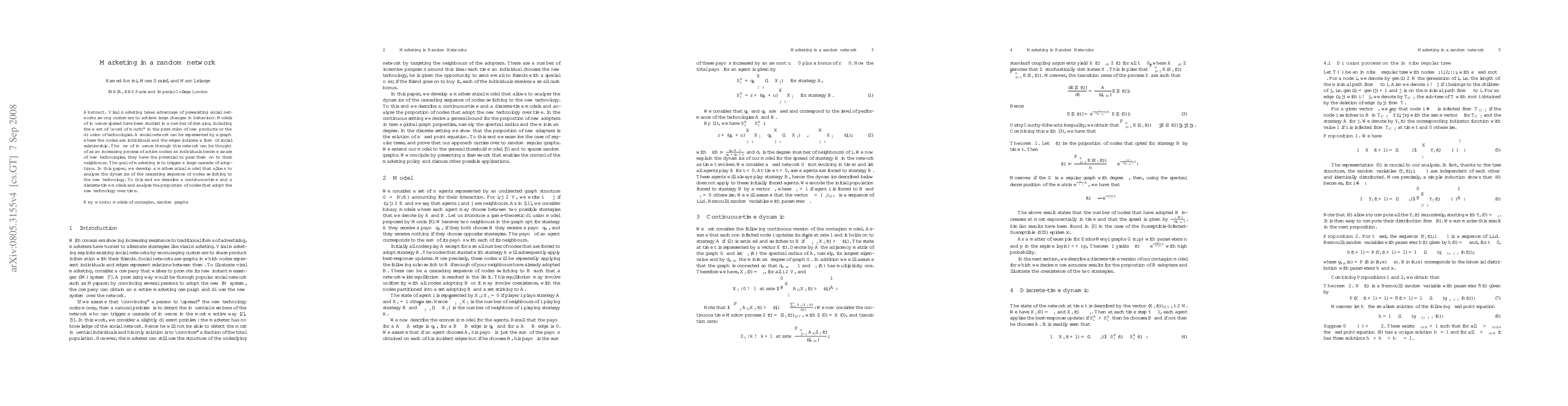 Viral marketing takes advantage of preexisting social networks among customers to achieve large changes in behaviour. Models of influence spread have been studied in a number of domains, including the effect of "word of mouth" in the promotion of new products or the diffusion of technologies. A social network can be represented by a graph where the nodes are individuals and the edges indicate a form of social relationship. The flow of influence through this network can be thought of as an increasing process of active nodes: as individuals become aware of new technologies, they have the potential to pass them on to their neighbours. The goal of marketing is to trigger a large cascade of adoptions. In this paper, we develop a mathematical model that allows to analyze the dynamics of the cascading sequence of nodes switching to the new technology. To this end we describe a continuous-time and a discrete-time models and analyse the proportion of nodes that adopt the new technology over time.