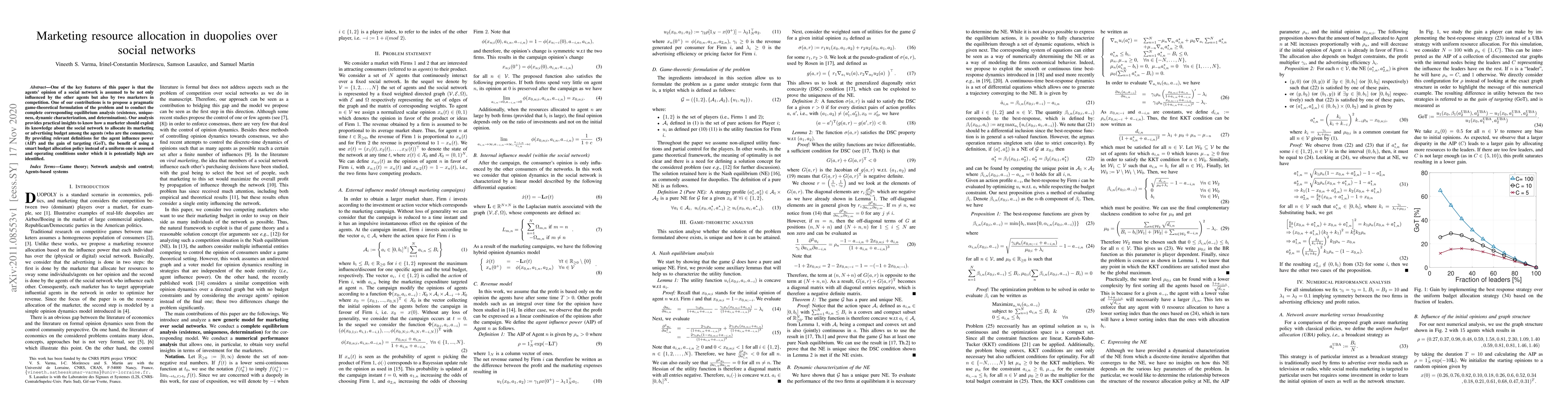 The paper proposes a game-theoretical formulation for marketing resource allocation in duopolies over social networks, analyzing the equilibrium using concepts like agent influence power (AIP) and gain of targeting (GoT).