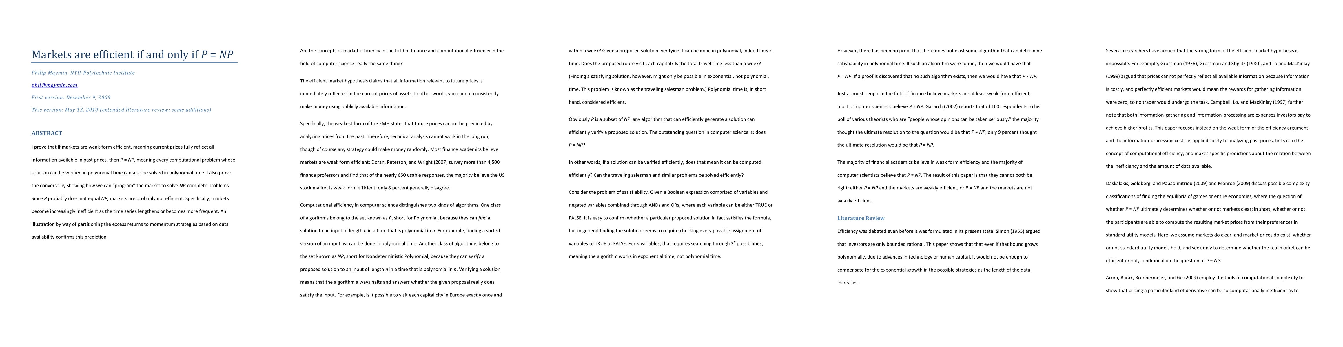 Markets are efficient if and only if P = NP, suggesting that most markets may not be efficient due to the likely separation between P and NP.