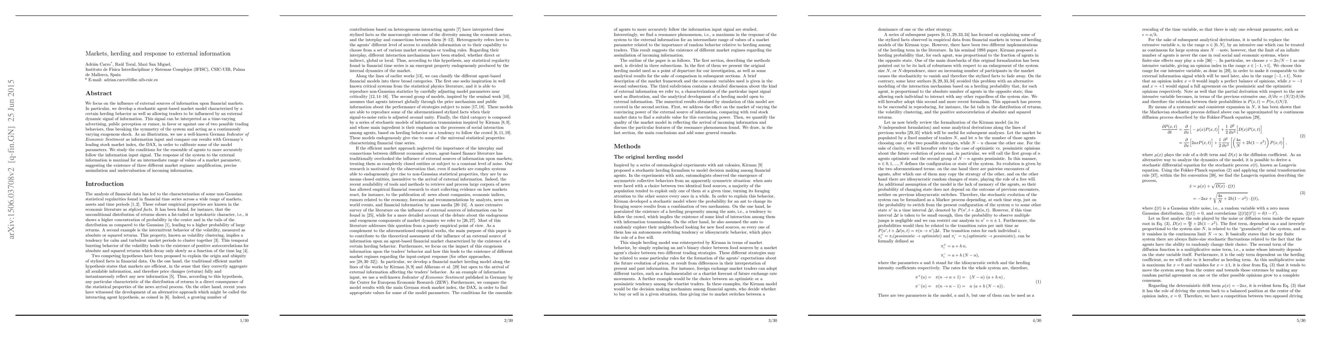 This paper develops a stochastic agent-based market model to analyze how external information influences financial markets, focusing on herding behavior and the impact of dynamic signals. It identifies three market regimes: amplification, precise assimilation, and undervaluation of external information, with maximal response occurring at an intermediate range of market parameters.