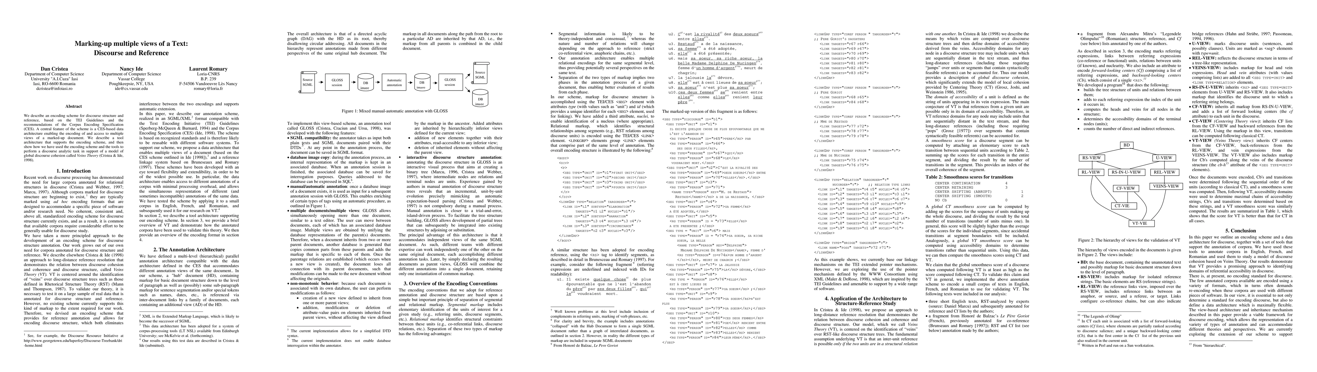 We describe an encoding scheme for discourse structure and reference, based on the TEI Guidelines and the recommendations of the Corpus Encoding Specification (CES). A central feature of the scheme is a CES-based data architecture enabling the encoding of and access to multiple views of a marked-up document. We describe a tool architecture that supports the encoding scheme, and then show how we have used the encoding scheme and the tools to perform a discourse analytic task in support of a model of global discourse cohesion called Veins Theory (Cristea & Ide, 1998).