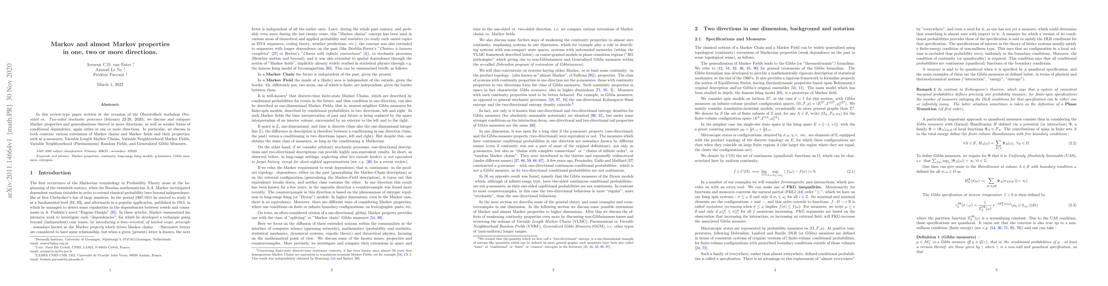 This paper reviews Markov and generalized Markov properties in stochastic processes across one or multiple directions, comparing traditional Markov chains and fields with extensions like $g$-measures, Variable Length Markov Chains, and Generalized Gibbs Measures. It also explores weaker forms of conditional dependence in these contexts.