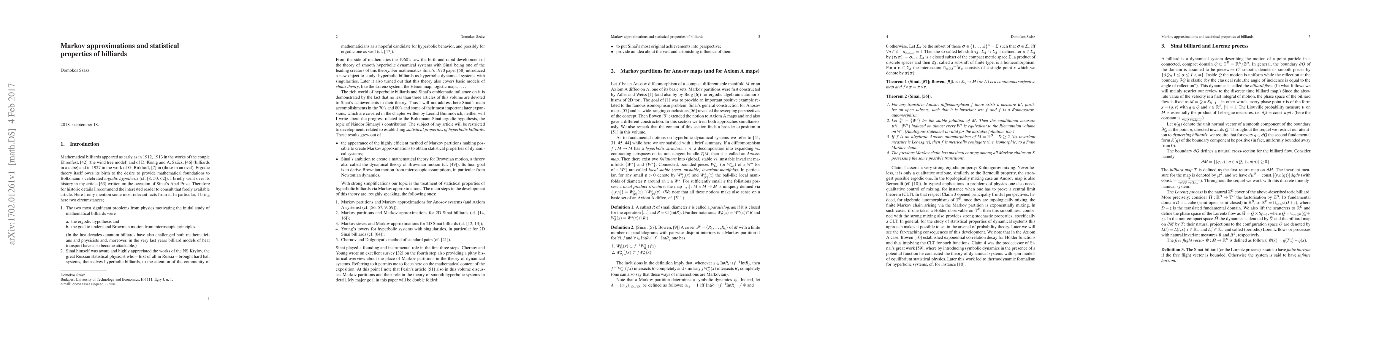 This paper surveys the evolution of Markov partitions, starting from Sinai and Bowen's original designs, to more flexible variants like Markov sieves, towers, and standard pairs, which have been developed to better describe statistical properties of hyperbolic billiards and other uniformly hyperbolic systems.