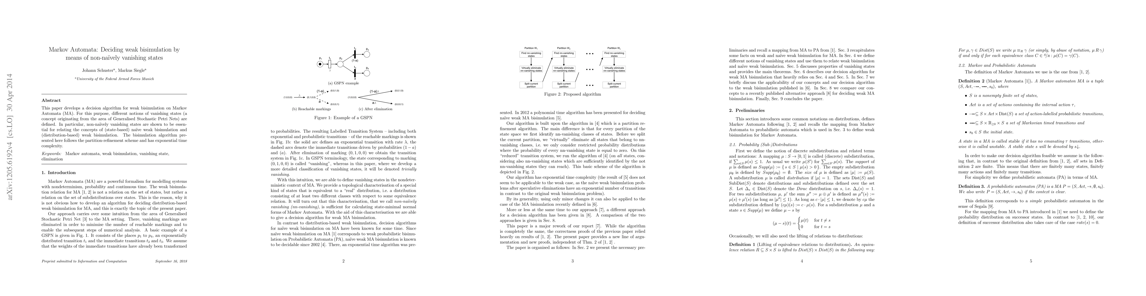 This paper proposes a decision algorithm for weak bisimulation in Markov Automata, leveraging notions of vanishing states. It employs a partition-refinement scheme and has exponential time complexity.