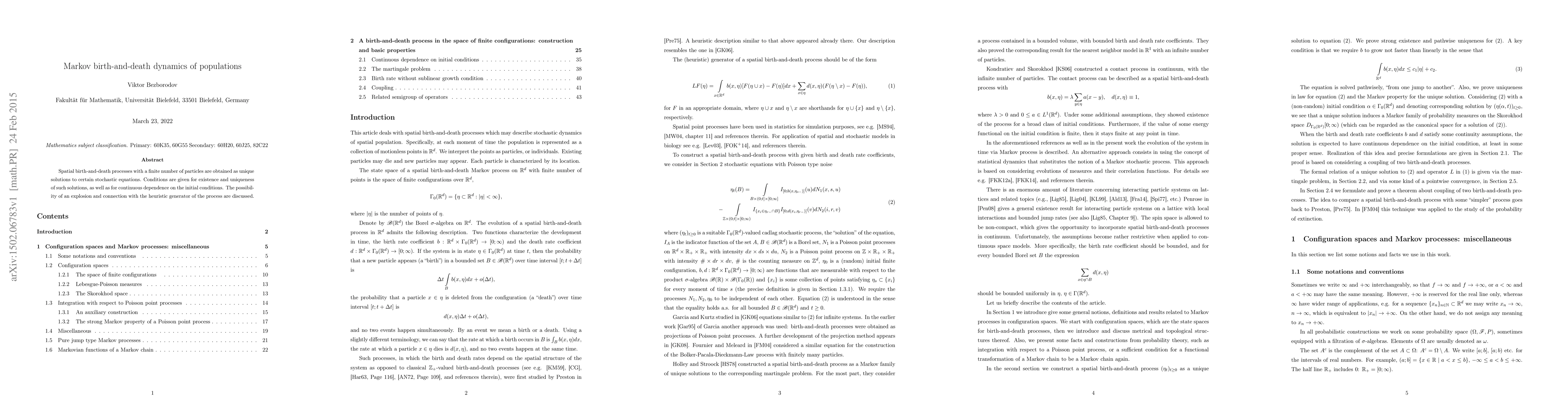 This paper investigates spatial birth-and-death processes for populations with a finite number of particles, focusing on existence, uniqueness, and continuous dependence on initial conditions. It also explores the possibility of explosion and its connection to a heuristic generator of the process.