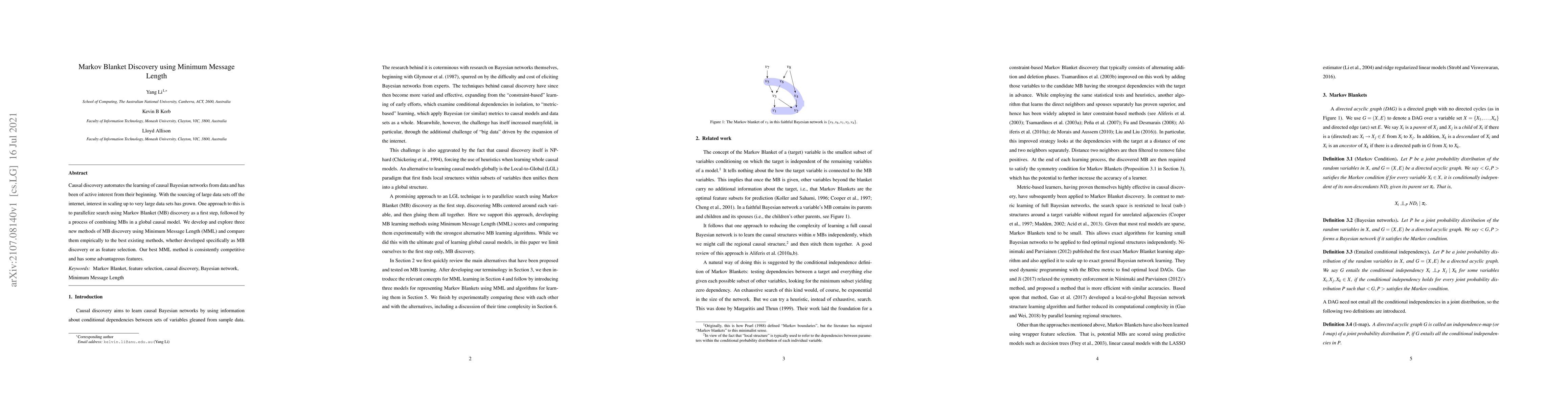 This paper proposes three new methods for Markov Blanket discovery using Minimum Message Length (MML) and evaluates them against existing techniques. The developed MML methods show competitive performance and offer advantageous features for scaling causal discovery to large datasets.