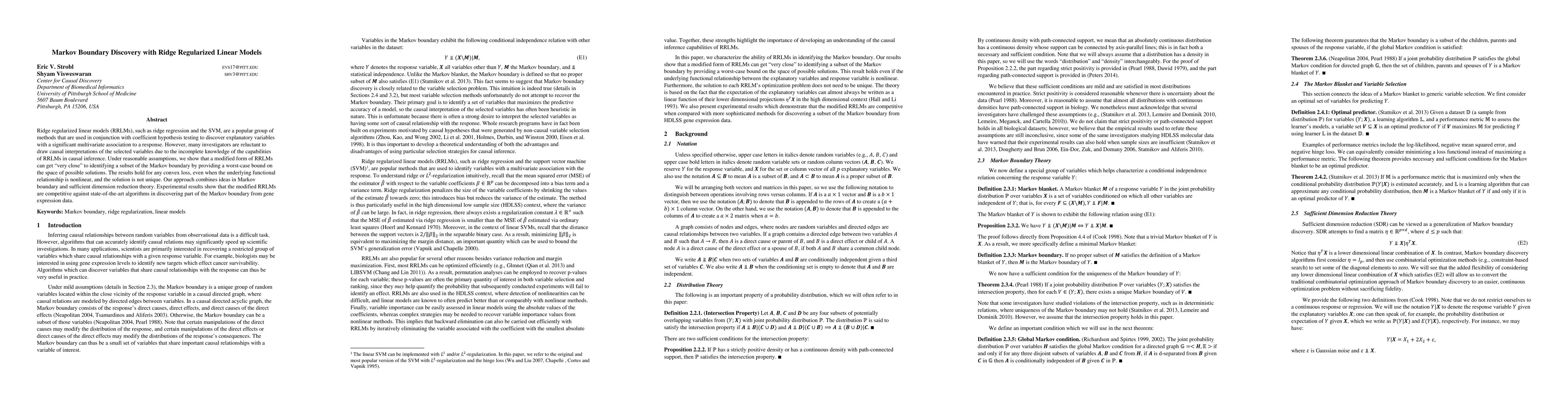 Ridge regularized linear models (RRLMs), such as ridge regression and the SVM, are a popular group of methods that are used in conjunction with coefficient hypothesis testing to discover explanatory variables with a significant multivariate association to a response. However, many investigators are reluctant to draw causal interpretations of the selected variables due to the incomplete knowledge of the capabilities of RRLMs in causal inference. Under reasonable assumptions, we show that a modified form of RRLMs can get very close to identifying a subset of the Markov boundary by providing a worst-case bound on the space of possible solutions. The results hold for any convex loss, even when the underlying functional relationship is nonlinear, and the solution is not unique. Our approach combines ideas in Markov boundary and sufficient dimension reduction theory. Experimental results show that the modified RRLMs are competitive against state-of-the-art algorithms in discovering part of the Markov boundary from gene expression data.
