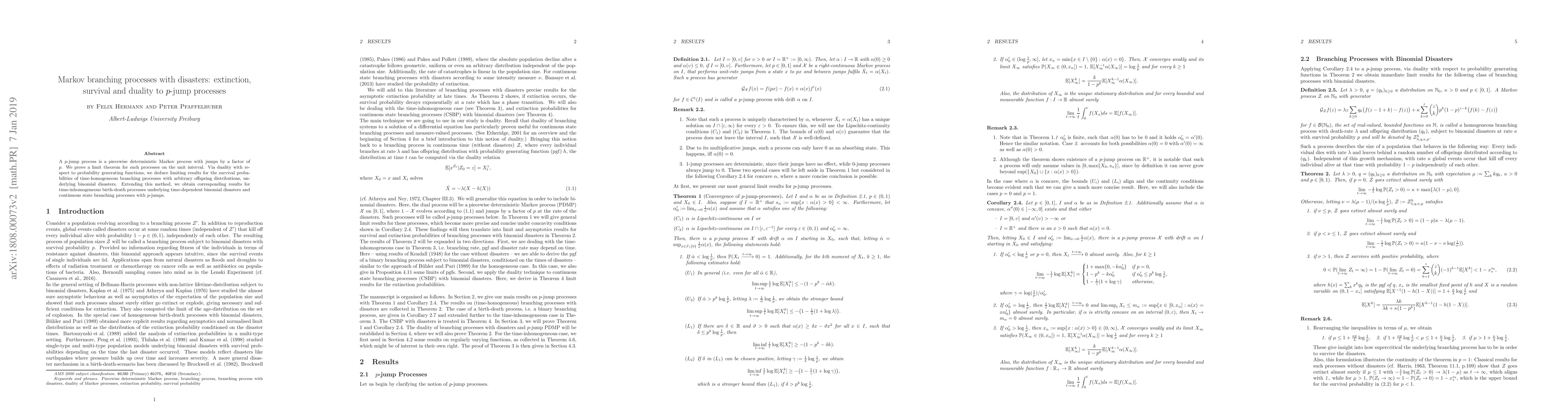 A $p$-jump process is a piecewise deterministic Markov process with jumps by a factor of $p$. We prove a limit theorem for such processes on the unit interval. Via duality with respect to probability generating functions, we deduce limiting results for the survival probabilities of time-homogeneous branching processes with arbitrary offspring distributions, underlying binomial disasters. Extending this method, we obtain corresponding results for time-inhomogeneous birth-death processes underlying time-dependent binomial disasters and continuous state branching processes with $p$-jumps.