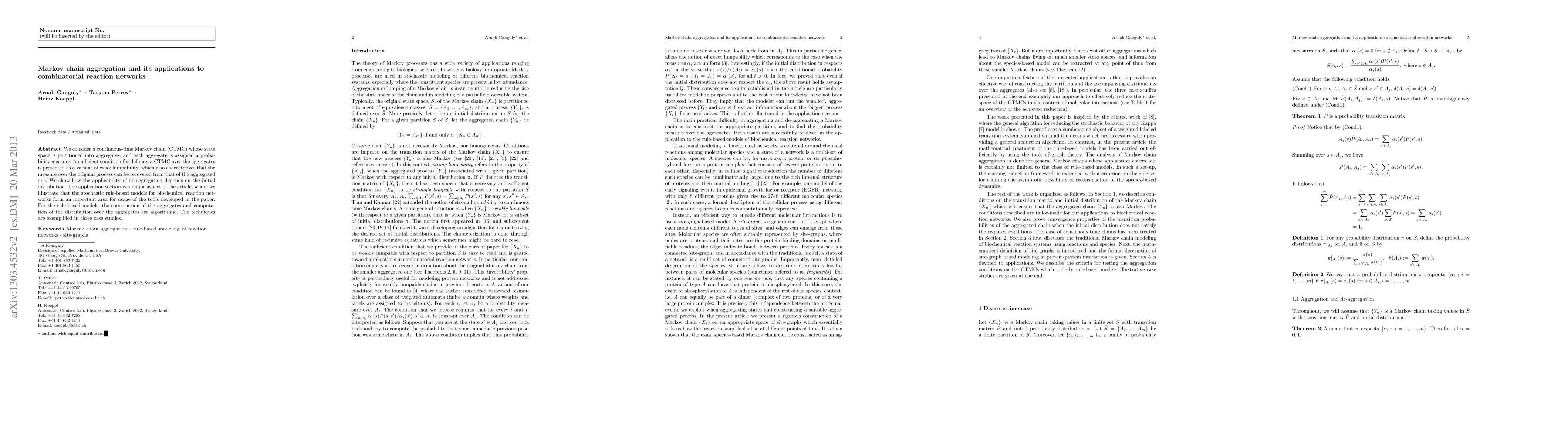 We consider a continuous-time Markov chain (CTMC) whose state space is partitioned into aggregates, and each aggregate is assigned a probability measure. A sufficient condition for defining a CTMC over the aggregates is presented as a variant of weak lumpability, which also characterizes that the measure over the original process can be recovered from that of the aggregated one. We show how the applicability of de-aggregation depends on the initial distribution. The application section is a major aspect of the article, where we illustrate that the stochastic rule-based models for biochemical reaction networks form an important area for usage of the tools developed in the paper. For the rule-based models, the construction of the aggregates and computation of the distribution over the aggregates are algorithmic. The techniques are exemplified in three case studies.