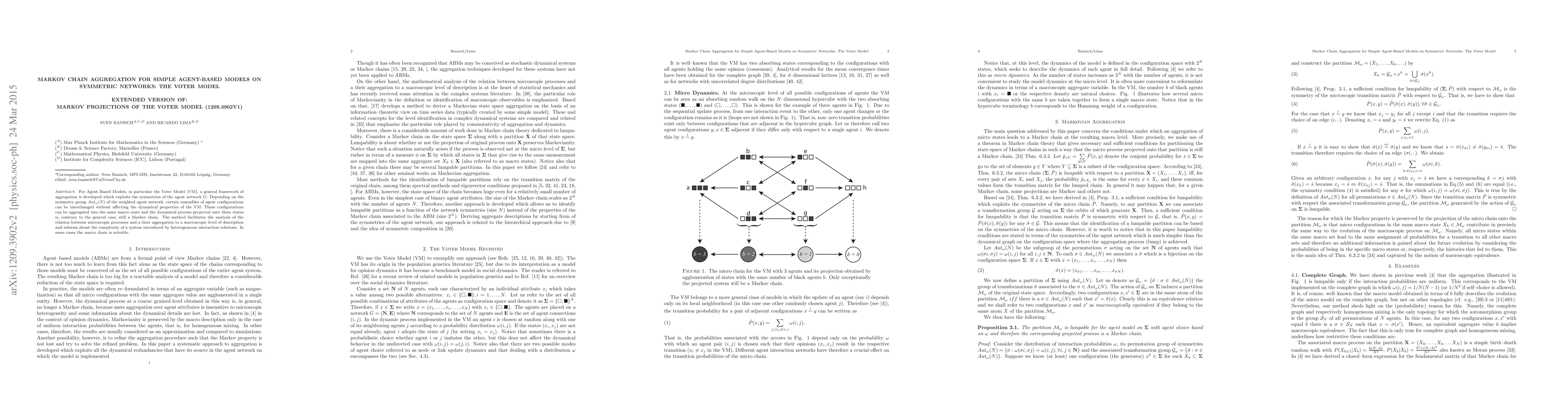 For Agent Based Models, in particular the Voter Model (VM), a general framework of aggregation is developed which exploits the symmetries of the agent network $G$. Depending on the symmetry group $Aut_{\omega} (N)$ of the weighted agent network, certain ensembles of agent configurations can be interchanged without affecting the dynamical properties of the VM. These configurations can be aggregated into the same macro state and the dynamical process projected onto these states is, contrary to the general case, still a Markov chain. The method facilitates the analysis of the relation between microscopic processes and a their aggregation to a macroscopic level of description and informs about the complexity of a system introduced by heterogeneous interaction relations. In some cases the macro chain is solvable.