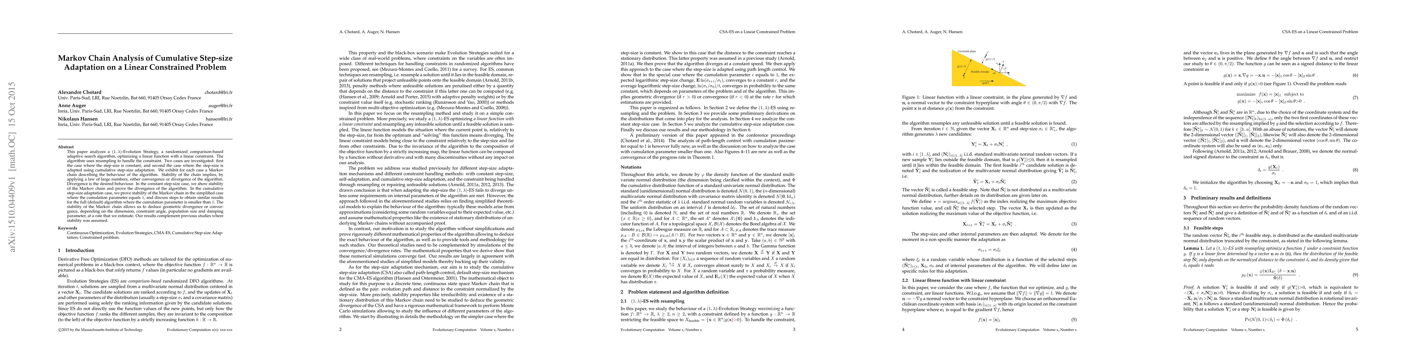 This paper analyzes a (1, $\lambda$)-Evolution Strategy, a randomized comparison-based adaptive search algorithm, optimizing a linear function with a linear constraint. The algorithm uses resampling to handle the constraint. Two cases are investigated: first the case where the step-size is constant, and second the case where the step-size is adapted using cumulative step-size adaptation. We exhibit for each case a Markov chain describing the behaviour of the algorithm. Stability of the chain implies, by applying a law of large numbers, either convergence or divergence of the algorithm. Divergence is the desired behaviour. In the constant step-size case, we show stability of the Markov chain and prove the divergence of the algorithm. In the cumulative step-size adaptation case, we prove stability of the Markov chain in the simplified case where the cumulation parameter equals 1, and discuss steps to obtain similar results for the full (default) algorithm where the cumulation parameter is smaller than 1. The stability of the Markov chain allows us to deduce geometric divergence or convergence , depending on the dimension, constraint angle, population size and damping parameter, at a rate that we estimate. Our results complement previous studies where stability was assumed.