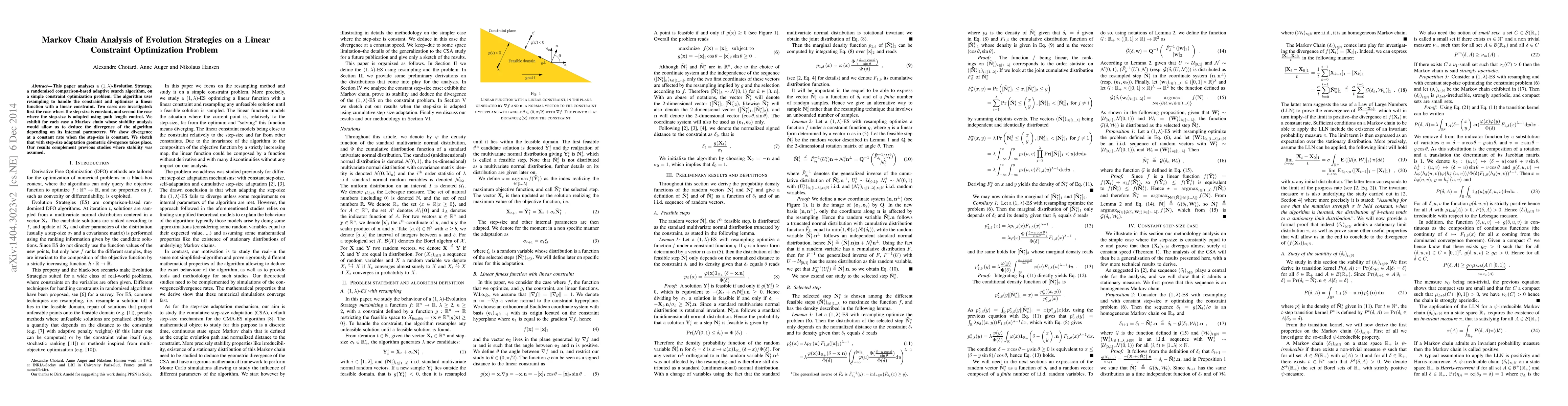 The paper presents a Markov chain analysis of a (1,λ)-ES for a linear constraint optimization problem, demonstrating divergence rates for constant and adaptive step-sizes.