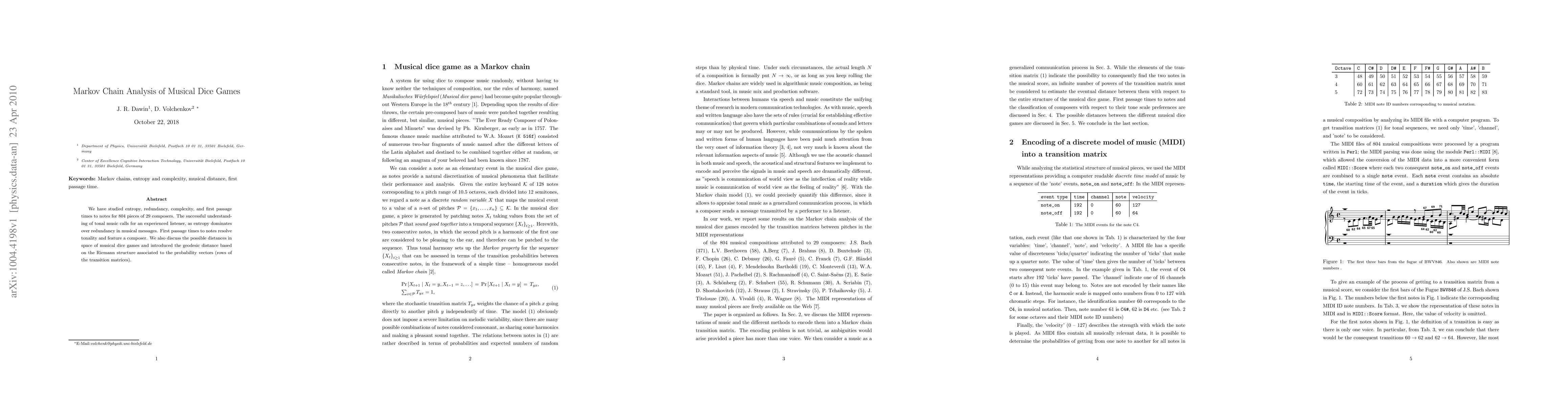 This paper employs Markov chain analysis to explore entropy, redundancy, and complexity in 804 pieces by 29 composers, highlighting how first passage times to notes reveal unique tonal characteristics and composer styles. It introduces a geodesic distance based on Riemannian structure for analyzing distances in musical dice games.