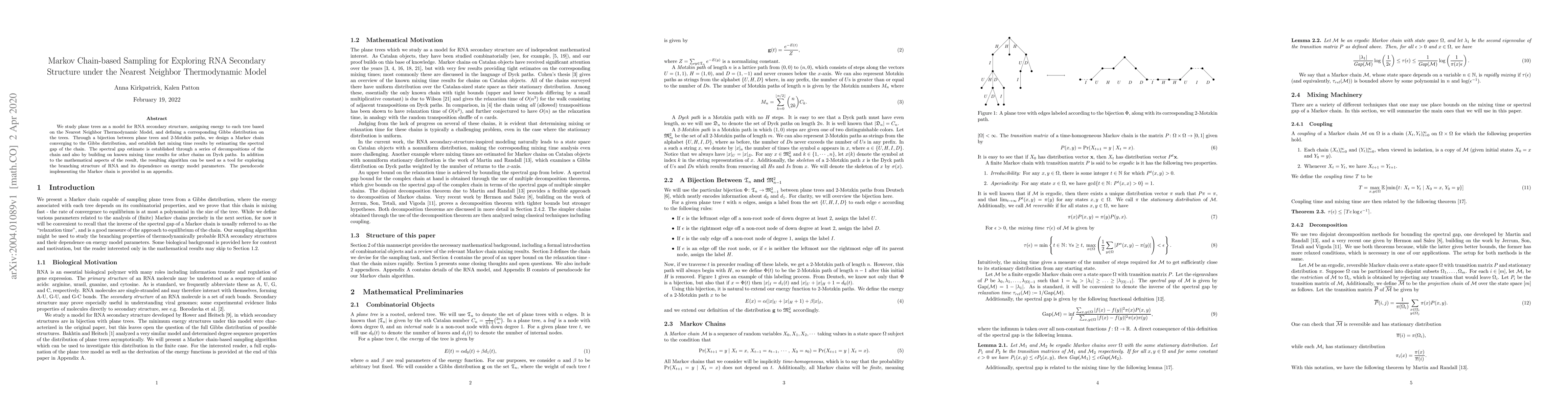 This paper develops a Markov chain-based sampling method for exploring RNA secondary structures under the Nearest Neighbor Thermodynamic Model, leveraging plane trees and 2-Motzkin paths. The study establishes fast mixing time results and provides an algorithm for analyzing RNA structure dependency on energy parameters.