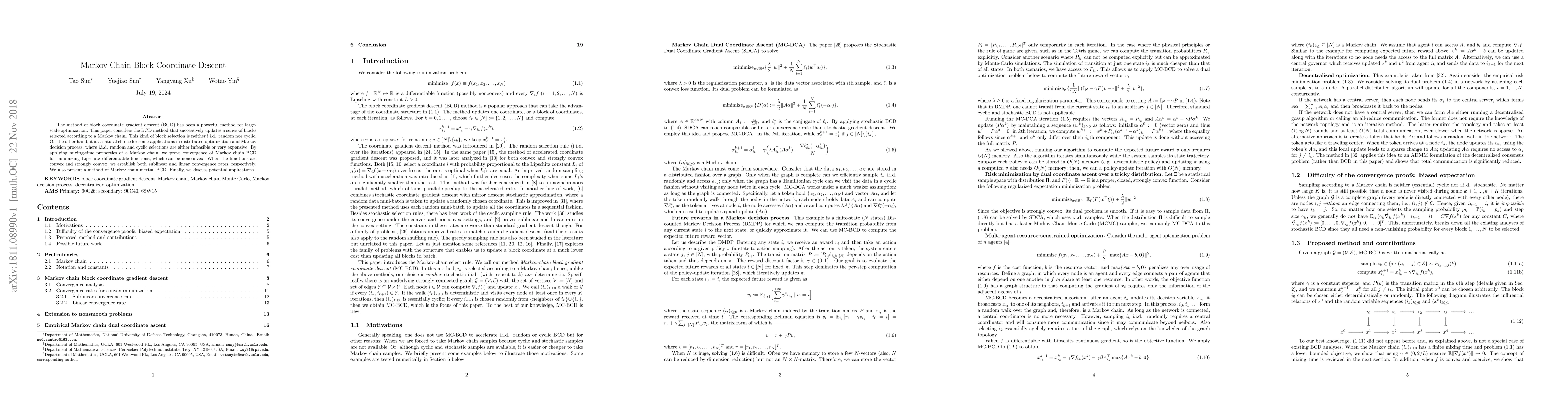 This paper proposes a Markov Chain Block Coordinate Descent (MCBCD) method for large-scale optimization, where blocks are updated according to a Markov chain. It proves convergence and establishes convergence rates for both nonconvex and convex functions, and introduces an inertial version of MCBCD. The method is particularly suited for distributed optimization and Markov decision processes.