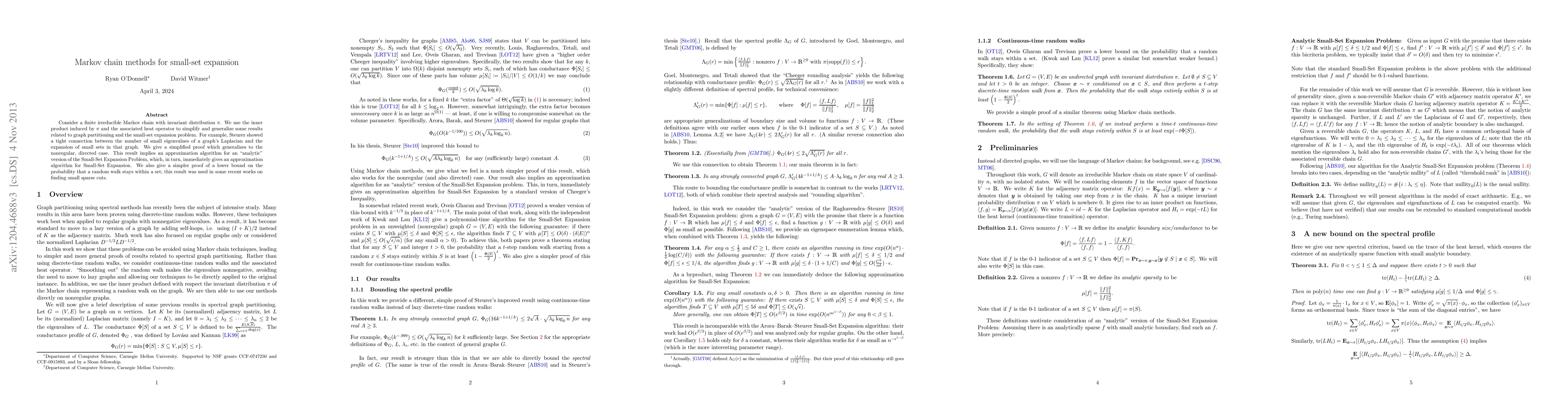 This paper uses Markov chain methods to simplify and generalize results on graph partitioning and the small-set expansion problem, providing a new approximation algorithm for Small-Set Expansion and a simpler proof for the probability that a random walk stays within a set.