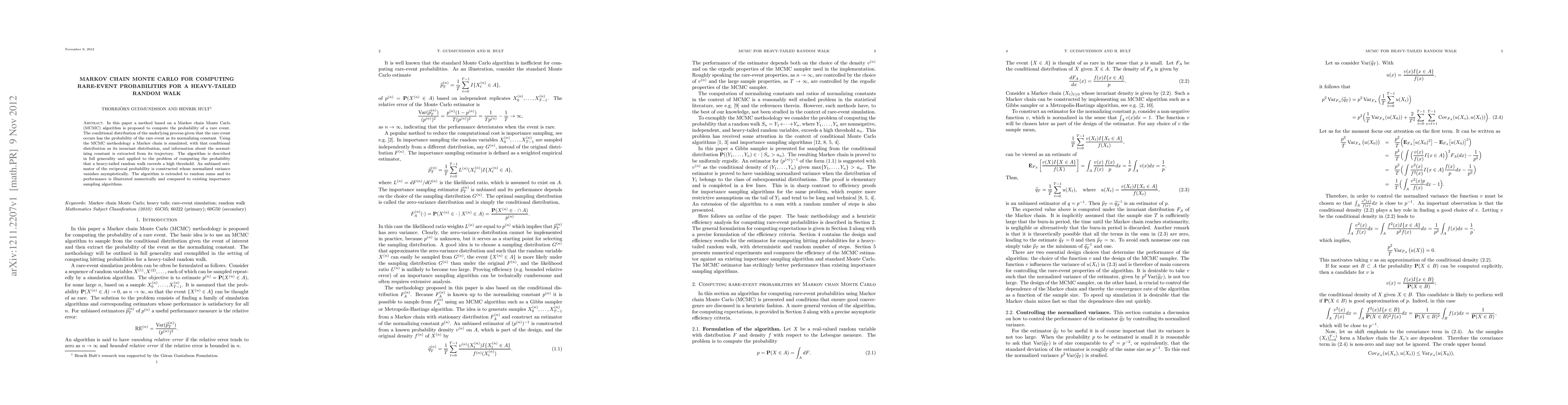 This paper proposes a Markov chain Monte Carlo (MCMC) method for computing rare-event probabilities, specifically for a heavy-tailed random walk. The algorithm extracts information about the rare event's probability from the trajectory of a simulated Markov chain, achieving an unbiased estimator with vanishing variance.