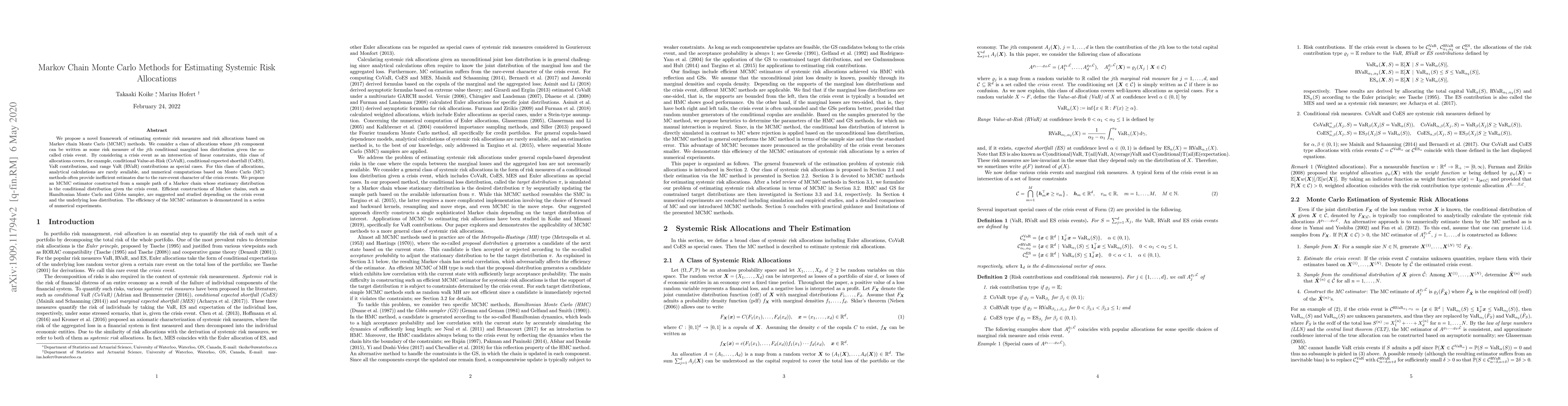 This paper proposes a novel framework for estimating systemic risk measures and risk allocations using Markov Chain Monte Carlo (MCMC) methods, focusing on allocations that consider crisis events as intersections of linear constraints. The authors demonstrate the efficiency of their MCMC estimators through numerical experiments, utilizing methods like Hamiltonian Monte Carlo and Gibbs sampling.