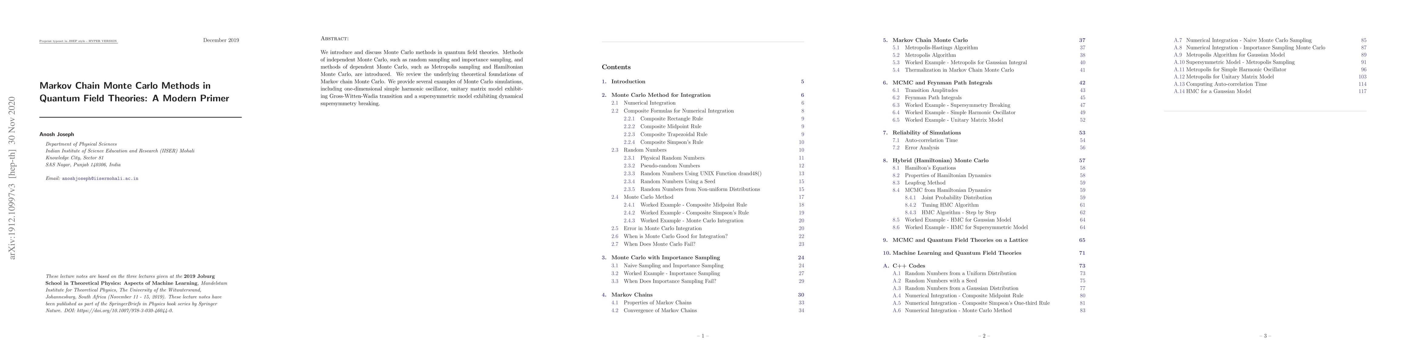 This paper provides an overview of Monte Carlo methods in quantum field theories, covering both independent and dependent sampling techniques like Metropolis and Hamiltonian Monte Carlo. It explores theoretical foundations and includes examples such as simple harmonic oscillators and supersymmetric models.