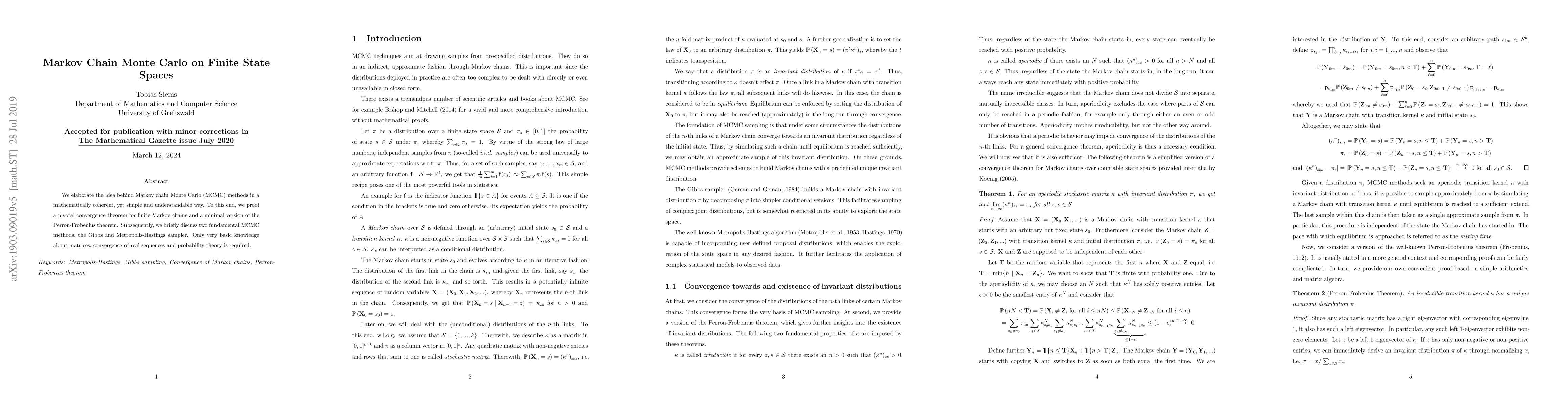 This paper provides a clear, accessible explanation of Markov chain Monte Carlo (MCMC) methods, proving a key convergence theorem for finite Markov chains and discussing the Gibbs and Metropolis-Hastings samplers, requiring minimal prerequisites in matrices, sequence convergence, and probability theory.