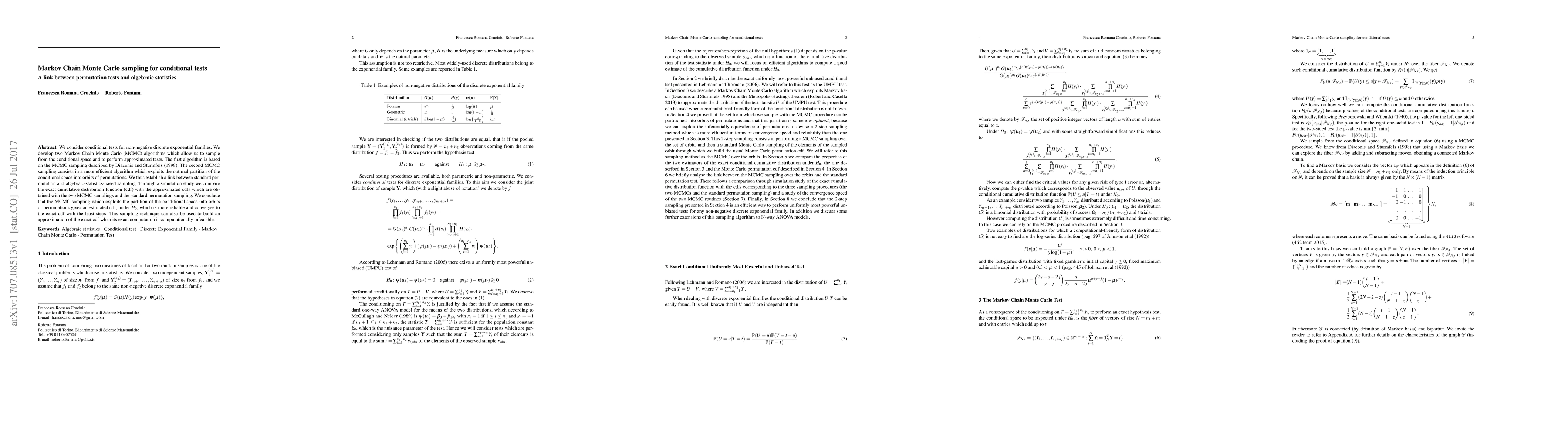 We consider conditional tests for non-negative discrete exponential families. We develop two Markov Chain Monte Carlo (MCMC) algorithms which allow us to sample from the conditional space and to perform approximated tests. The first algorithm is based on the MCMC sampling described by Sturmfels. The second MCMC sampling consists in a more efficient algorithm which exploits the optimal partition of the conditional space into orbits of permutations. We thus establish a link between standard permutation and algebraic-statistics-based sampling. Through a simulation study we compare the exact cumulative distribution function (cdf) with the approximated cdfs which are obtained with the two MCMC samplings and the standard permutation sampling. We conclude that the MCMC sampling which exploits the partition of the conditional space into orbits of permutations gives an estimated cdf, under $H_0$, which is more reliable and converges to the exact cdf with the least steps. This sampling technique can also be used to build an approximation of the exact cdf when its exact computation is computationally infeasible.