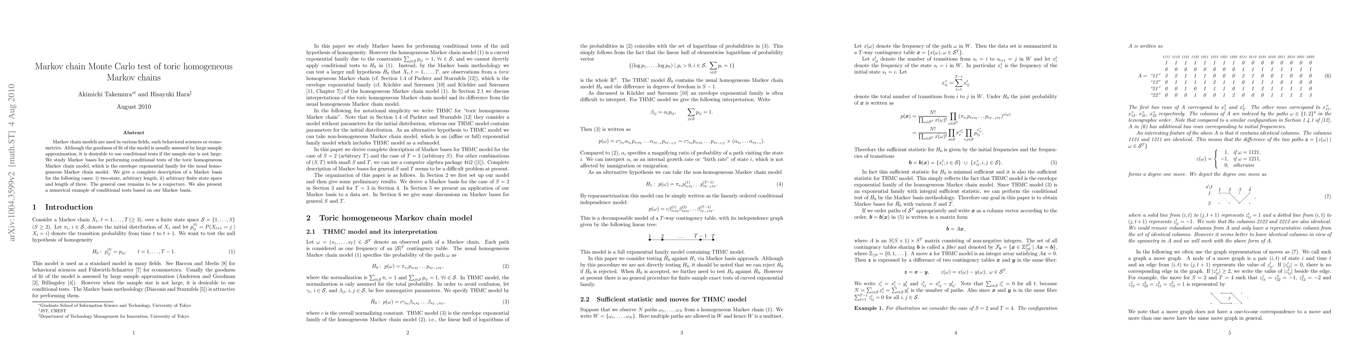 Markov chain models are used in various fields, such behavioral sciences or econometrics. Although the goodness of fit of the model is usually assessed by large sample approximation, it is desirable to use conditional tests if the sample size is not large. We study Markov bases for performing conditional tests of the toric homogeneous Markov chain model, which is the envelope exponential family for the usual homogeneous Markov chain model. We give a complete description of a Markov basis for the following cases: i) two-state, arbitrary length, ii) arbitrary finite state space and length of three. The general case remains to be a conjecture. We also present a numerical example of conditional tests based on our Markov basis.