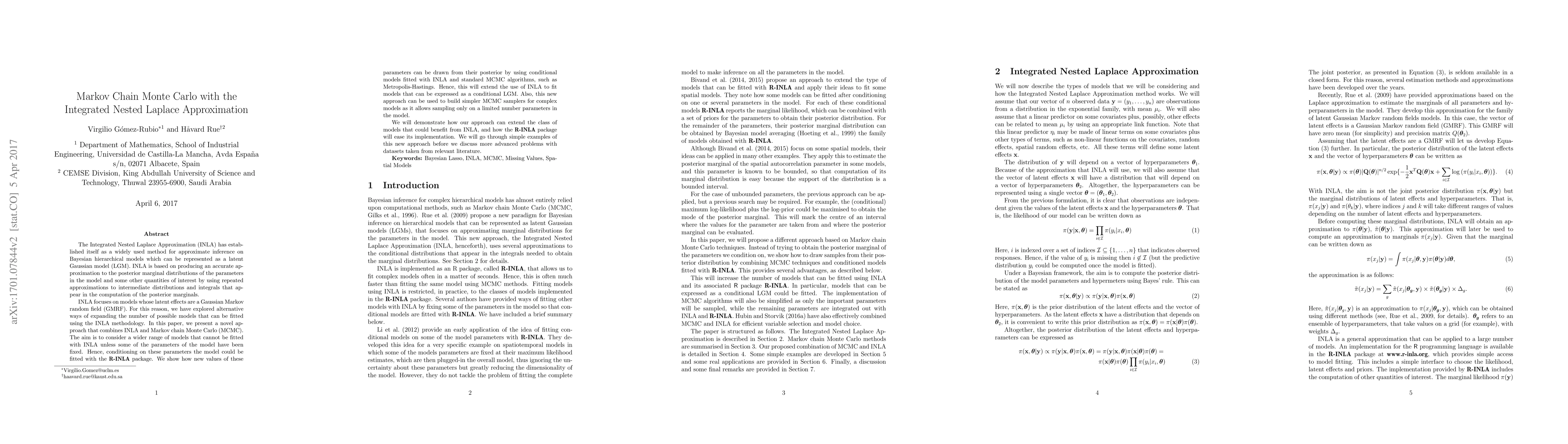 This paper introduces a novel method combining the Integrated Nested Laplace Approximation (INLA) with Markov Chain Monte Carlo (MCMC) to extend INLA's applicability to a wider range of Bayesian hierarchical models, particularly those that require conditional sampling. The approach leverages INLA for efficient approximations and MCMC for drawing new values of fixed parameters, thus broadening the scope of models that can be analyzed using INLA.