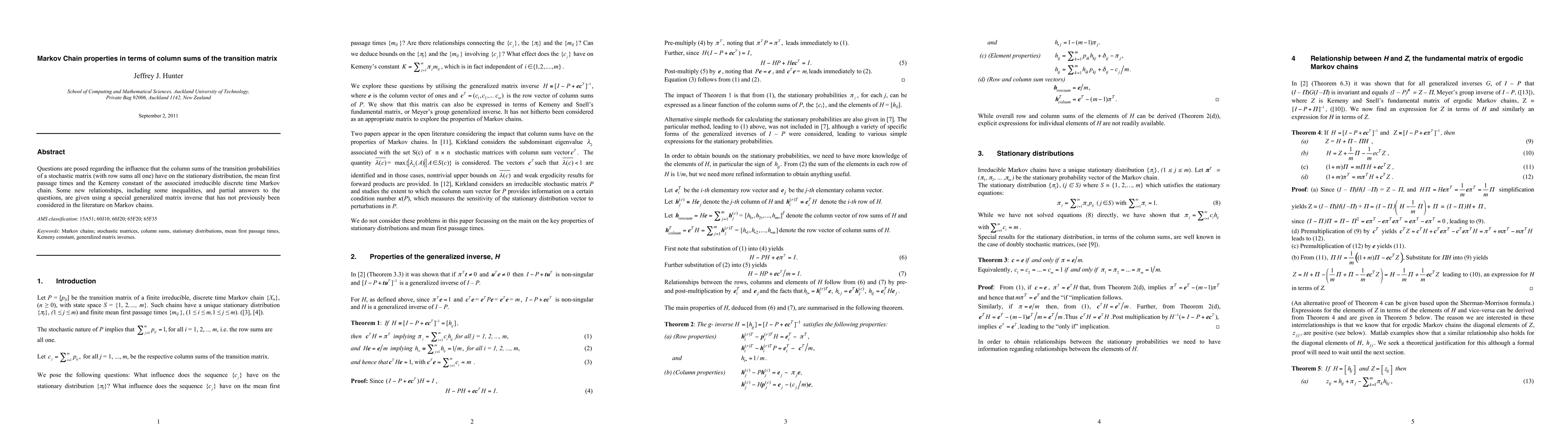 Questions are posed regarding the influence that the column sums of the transition probabilities of a stochastic matrix (with row sums all one) have on the stationary distribution, the mean first passage times and the Kemeny constant of the associated irreducible discrete time Markov chain. Some new relationships, including some inequalities, and partial answers to the questions, are given using a special generalized matrix inverse that has not previously been considered in the literature on Markov chains.