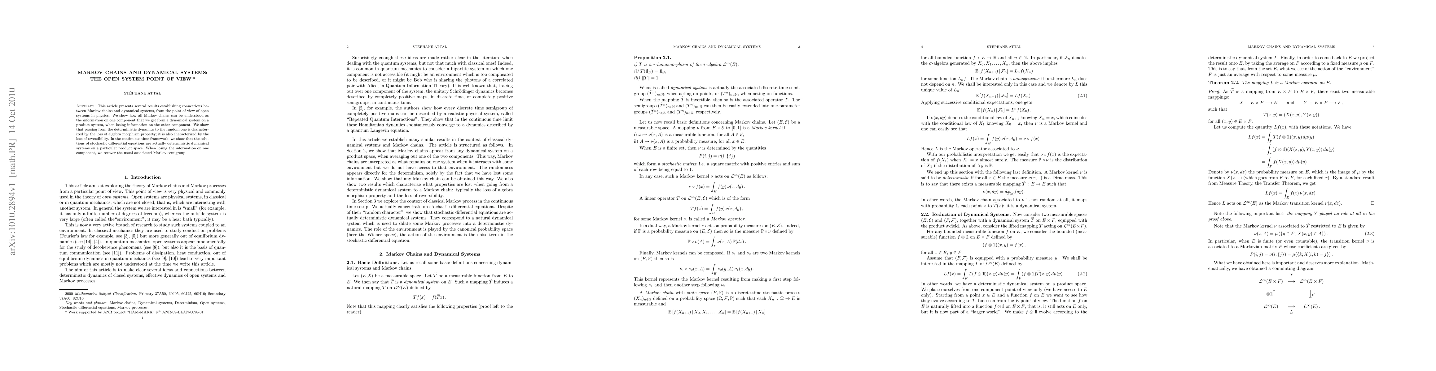 This article presents several results establishing connections be- tween Markov chains and dynamical systems, from the point of view of open systems in physics. We show how all Markov chains can be understood as the information on one component that we get from a dynamical system on a product system, when losing information on the other component. We show that passing from the deterministic dynamics to the random one is character- ized by the loss of algebra morphism property; it is also characterized by the loss of reversibility. In the continuous time framework, we show that the solu- tions of stochastic dierential equations are actually deterministic dynamical systems on a particular product space. When losing the information on one component, we recover the usual associated Markov semigroup.