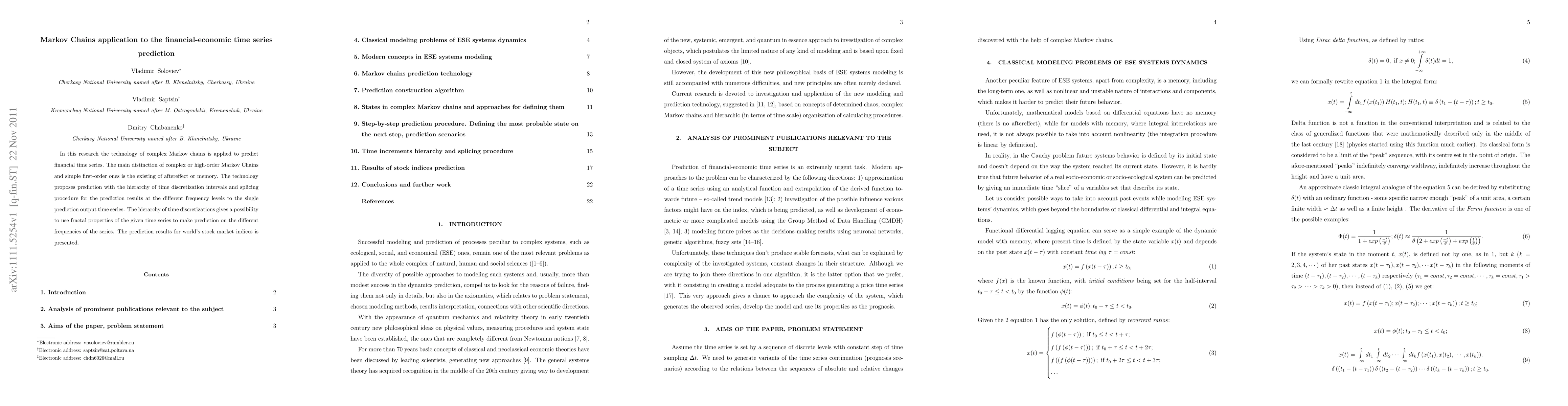 In this research the technology of complex Markov chains is applied to predict financial time series. The main distinction of complex or high-order Markov Chains and simple first-order ones is the existing of aftereffect or memory. The technology proposes prediction with the hierarchy of time discretization intervals and splicing procedure for the prediction results at the different frequency levels to the single prediction output time series. The hierarchy of time discretizations gives a possibility to use fractal properties of the given time series to make prediction on the different frequencies of the series. The prediction results for world's stock market indices is presented.