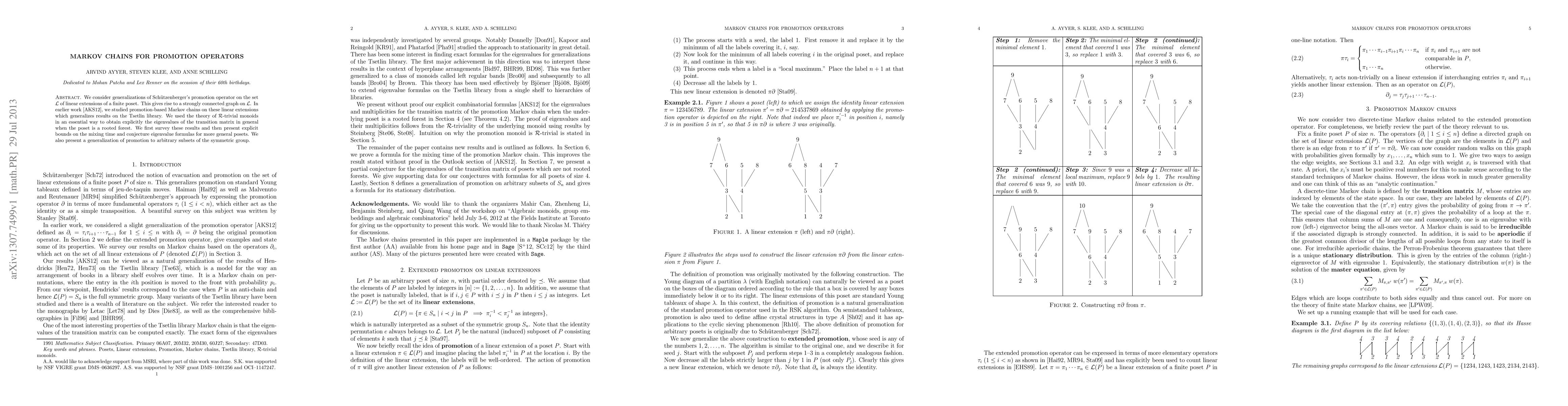 We consider generalizations of Schuetzenberger's promotion operator on the set L of linear extensions of a finite poset. This gives rise to a strongly connected graph on L. In earlier work (arXiv:1205.7074), we studied promotion-based Markov chains on these linear extensions which generalizes results on the Tsetlin library. We used the theory of R-trivial monoids in an essential way to obtain explicitly the eigenvalues of the transition matrix in general when the poset is a rooted forest. We first survey these results and then present explicit bounds on the mixing time and conjecture eigenvalue formulas for more general posets. We also present a generalization of promotion to arbitrary subsets of the symmetric group.