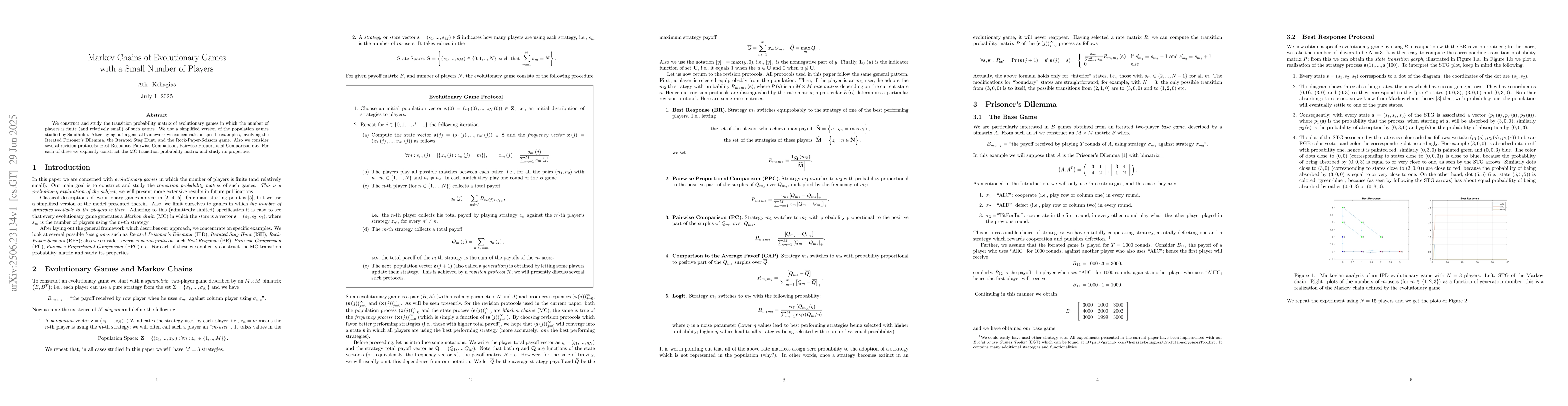 We construct and study the transition probability matrix of evolutionary games in which the number of players is finite (and relatively small) of such games. We use a simplified version of the population games studied by Sandholm. After laying out a general framework we concentrate on specific examples, involving the Iterated Prisoner's Dilemma, the Iterated Stag Hunt, and the Rock-Paper-Scissors game. Also we consider several revision protocols: Best Response, Pairwise Comparison, Pairwise Proportional Comparison etc. For each of these we explicitly construct the MC transition probability matrix and study its properties.