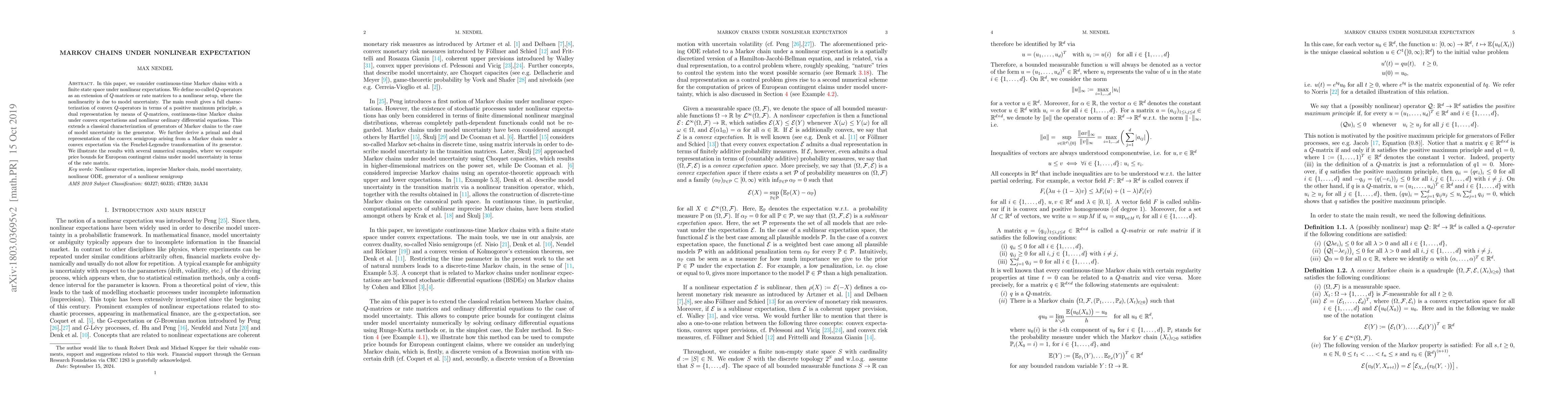 This paper characterizes continuous-time Markov chains under nonlinear expectations using Q-operators, extending classical Markov chain generators to model uncertainty. It provides a dual representation of convex Q-operators and computes price bounds for European contingent claims under model uncertainty.