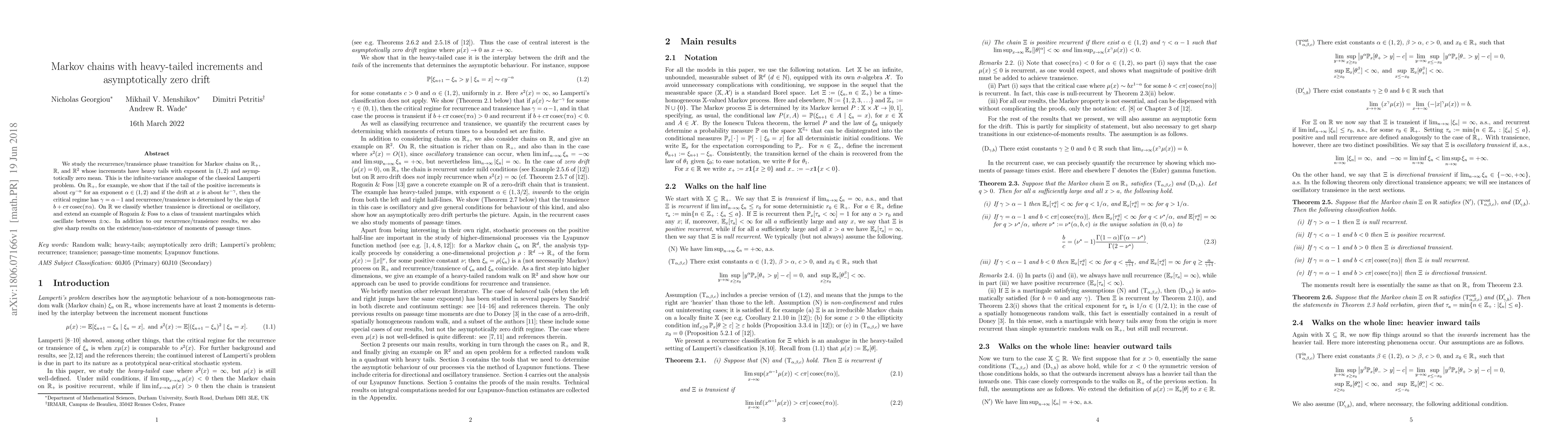This paper investigates the recurrence/transience phase transition for Markov chains with heavy-tailed increments and asymptotically zero drift on $\mathbb{R}_+$, $\mathbb{R}$, and $\mathbb{R}^2$. It determines critical regimes and conditions for recurrence/transience, and provides results on the existence of moments of passage times.