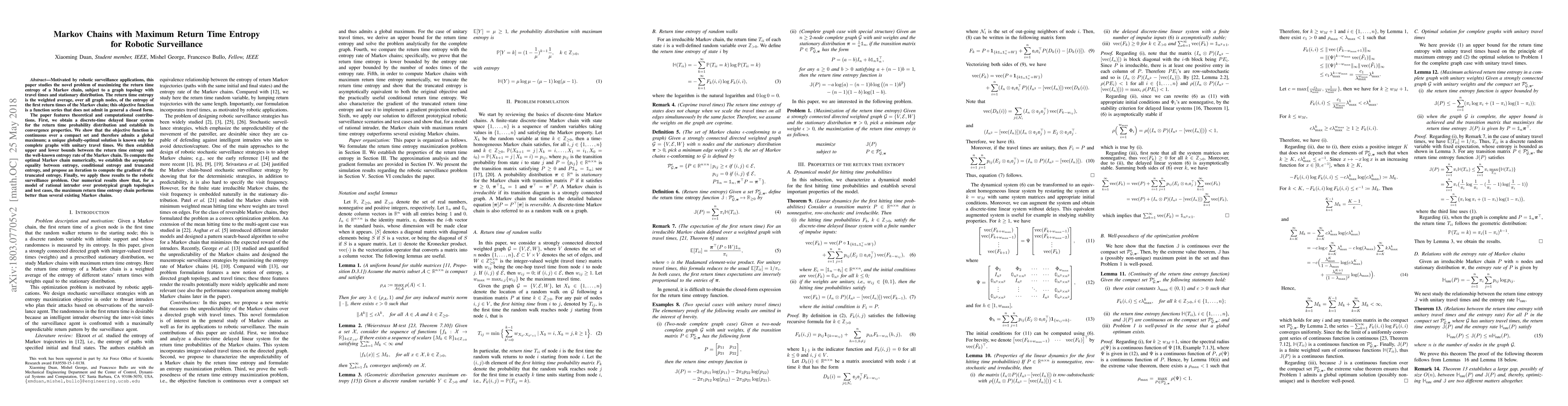 This paper explores maximizing the return time entropy of Markov chains for robotic surveillance, establishing convergence properties of a discrete-time delayed linear system and proving the existence of a global maximum. It proposes an iterative method for computing the gradient of truncated entropy and demonstrates superior performance of the optimal Markov chain in surveillance scenarios.