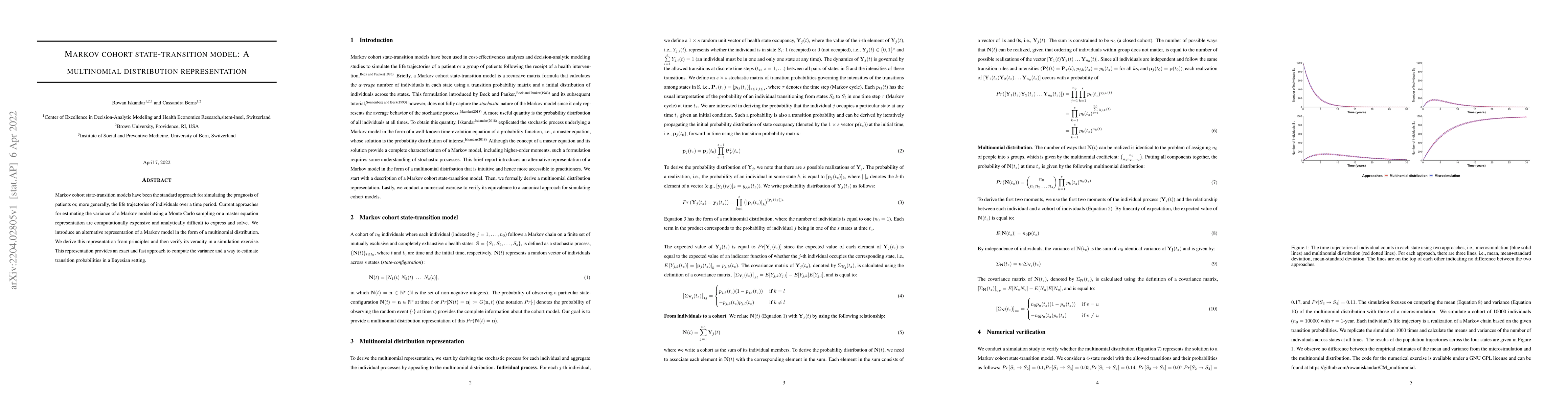 Markov cohort state-transition models have been the standard approach for simulating the prognosis of patients or, more generally, the life trajectories of individuals over a time period. Current approaches for estimating the variance of a Markov model using a Monte Carlo sampling or a master equation representation are computationally expensive and analytically difficult to express and solve. We introduce an alternative representation of a Markov model in the form of a multinomial distribution. We derive this representation from principles and then verify its veracity in a simulation exercise. This representation provides an exact and fast approach to compute the variance and a way to estimate transition probabilities in a Bayesian setting.