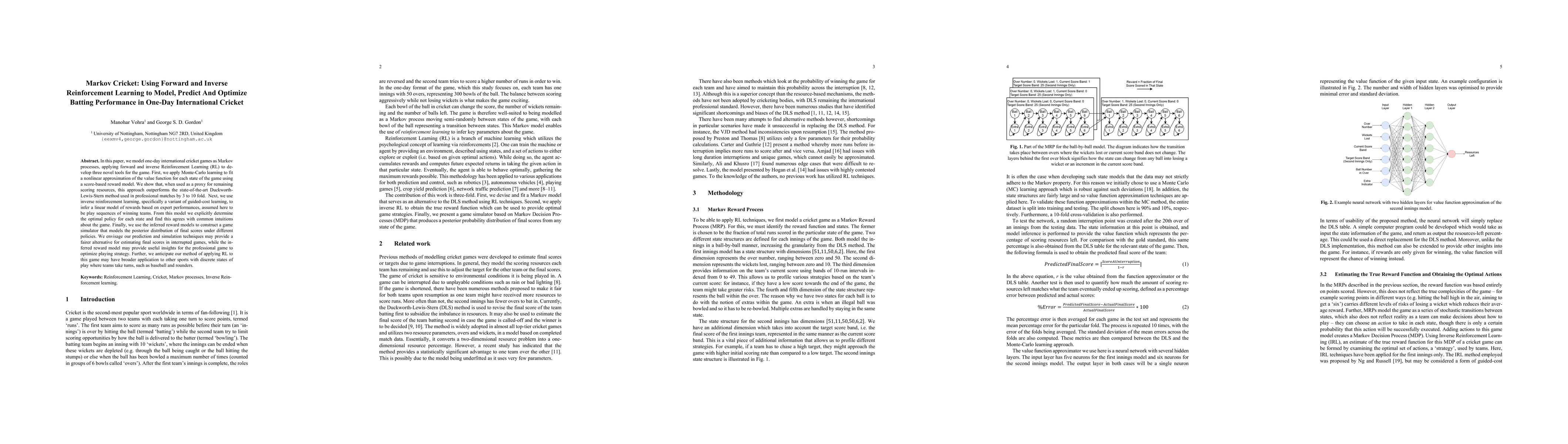 In this paper, we model one-day international cricket games as Markov processes, applying forward and inverse Reinforcement Learning (RL) to develop three novel tools for the game. First, we apply Monte-Carlo learning to fit a nonlinear approximation of the value function for each state of the game using a score-based reward model. We show that, when used as a proxy for remaining scoring resources, this approach outperforms the state-of-the-art Duckworth-Lewis-Stern method used in professional matches by 3 to 10 fold. Next, we use inverse reinforcement learning, specifically a variant of guided-cost learning, to infer a linear model of rewards based on expert performances, assumed here to be play sequences of winning teams. From this model we explicitly determine the optimal policy for each state and find this agrees with common intuitions about the game. Finally, we use the inferred reward models to construct a game simulator that models the posterior distribution of final scores under different policies. We envisage our prediction and simulation techniques may provide a fairer alternative for estimating final scores in interrupted games, while the inferred reward model may provide useful insights for the professional game to optimize playing strategy. Further, we anticipate our method of applying RL to this game may have broader application to other sports with discrete states of play where teams take turns, such as baseball and rounders.